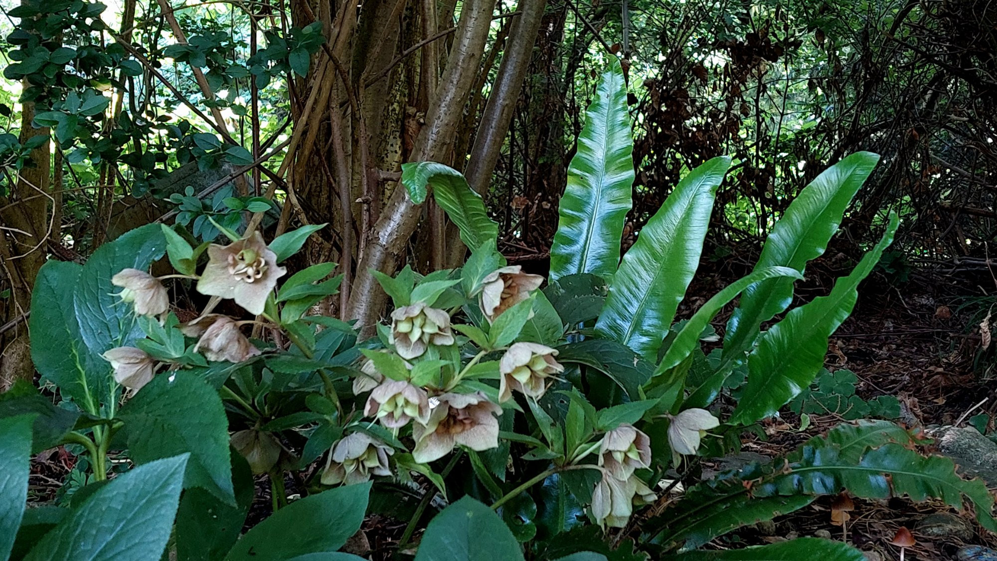 Das sind die beiden kräftigsten Exemplare des normalen Asplenium scolopendrium in unserem Garten. Jungpflanzen erscheinen bei uns überall in großer Zahl.