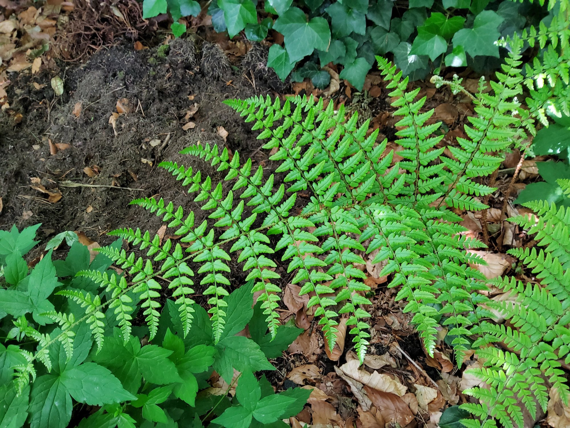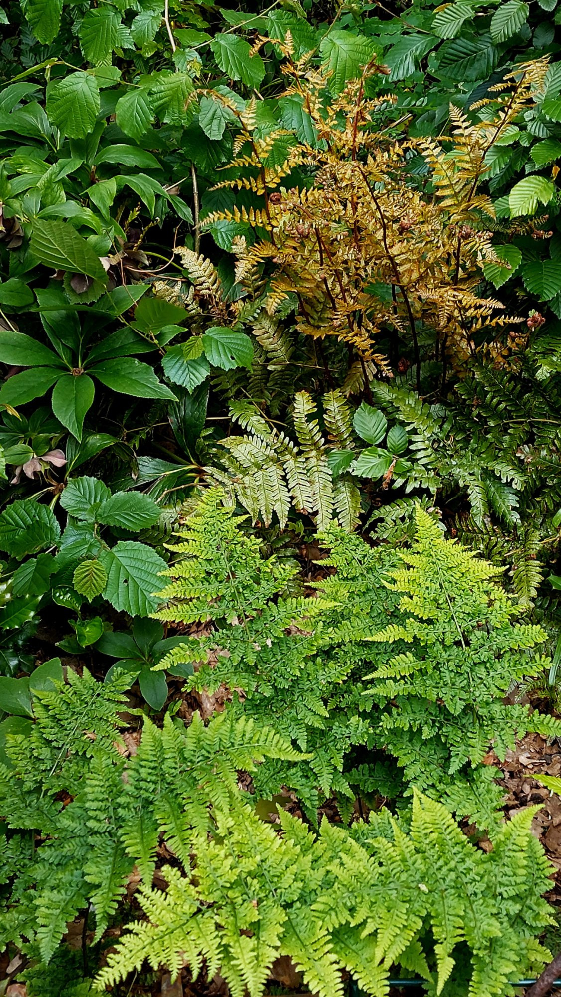Der tolle Austrieb von Asplenium scolopendrium. Und Athyrium niponicum 'variegat', da freue ich mich drüber.