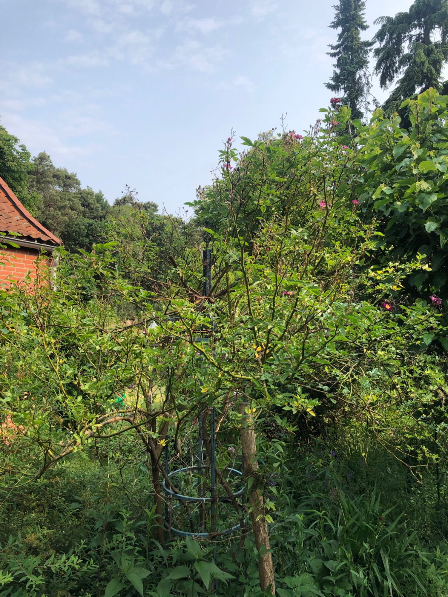 Also zur Erklärung. Ich habe die Rose mit Sicherheit schon mehr als 13 Jahre, seitdem ist sie 2x umgezogen und in den beiden vorherigen Gärten nur vor sich hingekrepelt. Daher dachte ich vor 5 Jahren, dass sie auch hier nicht so dolle wachsen wird und daher bekam sie einen Obelisken. Niemand konnte ahnen, dass sie hier so explodiert, aber es war ja auch klar, dass sie ihren Standort nochmal verlassen muss. Da die Scheune aufgrund anstehender Sanierungsarbeiten in den nächsten Jahren nicht zur Verfügung steht, bekommt sie einen neuen Platz mit einem Gerüst. Man kann sich das so vorstellen, dass es ein Querträger aus massiven Eichenbalken, auf gemauerten Pfeilern aufliegend ist, sehr lang. Und da kann sie klettern, unseretwegen auch aufs Haus.