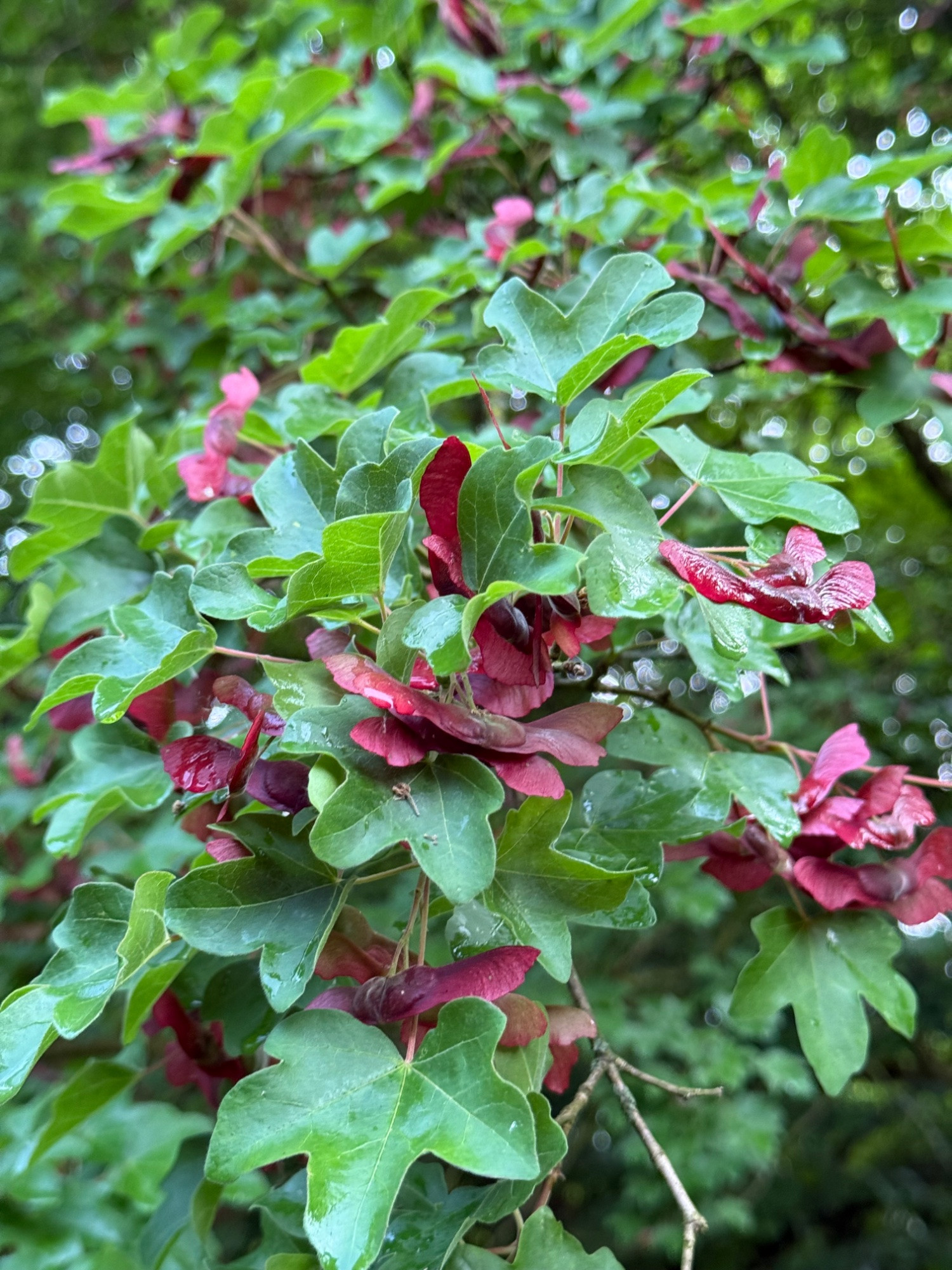 Die Sorte Acer campestre 'Red Shine' , zeichnet sich durch den zunächst roten Blatt austrieb und soll auch rötere Früchte haben