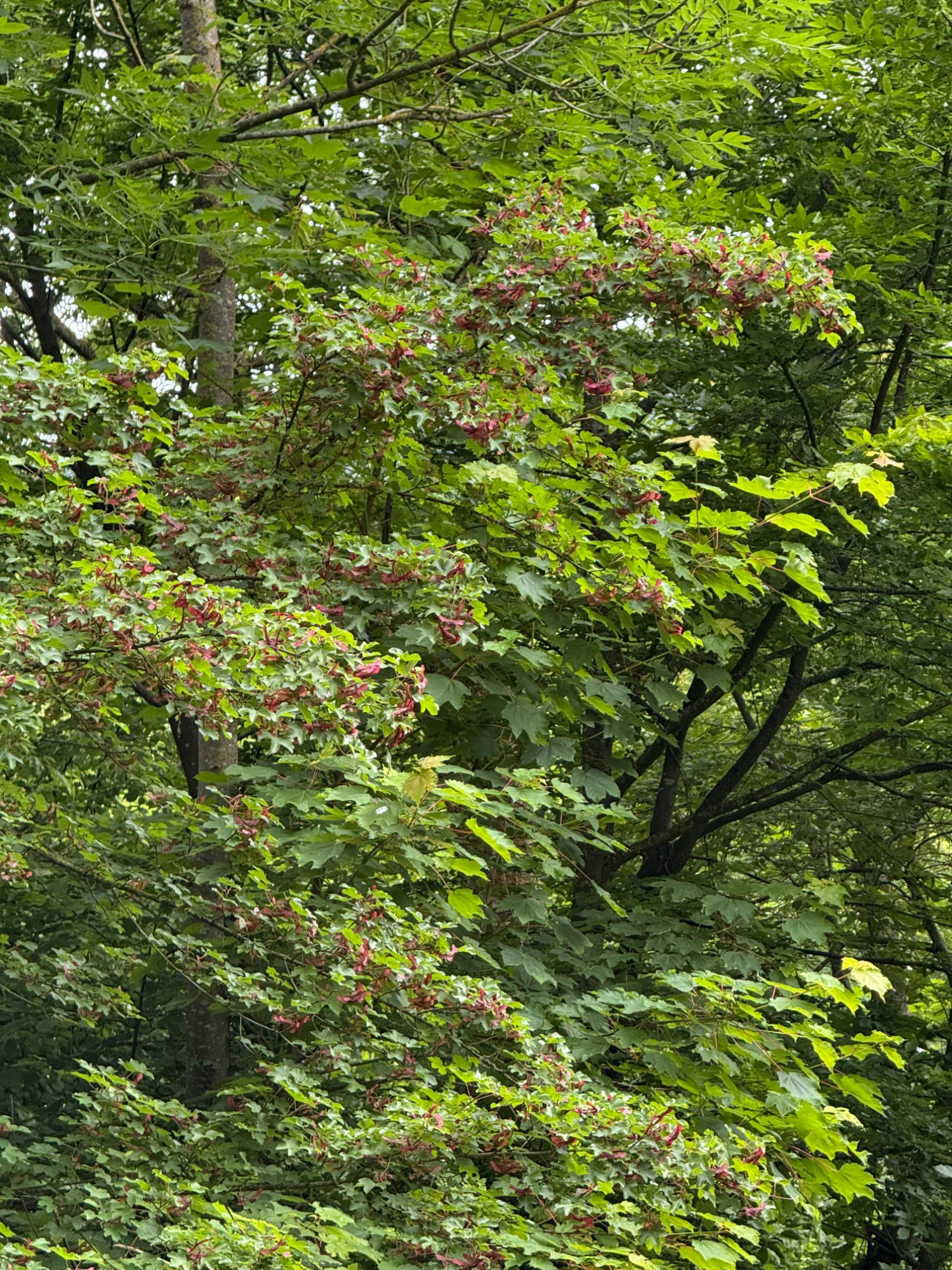 Hier sind die Früchte aller Ahorne noch winzig klein und grün, auch Feld-, Spitz- und Bergahorn. Ein Touch rosa bei den großen A. palmatum.