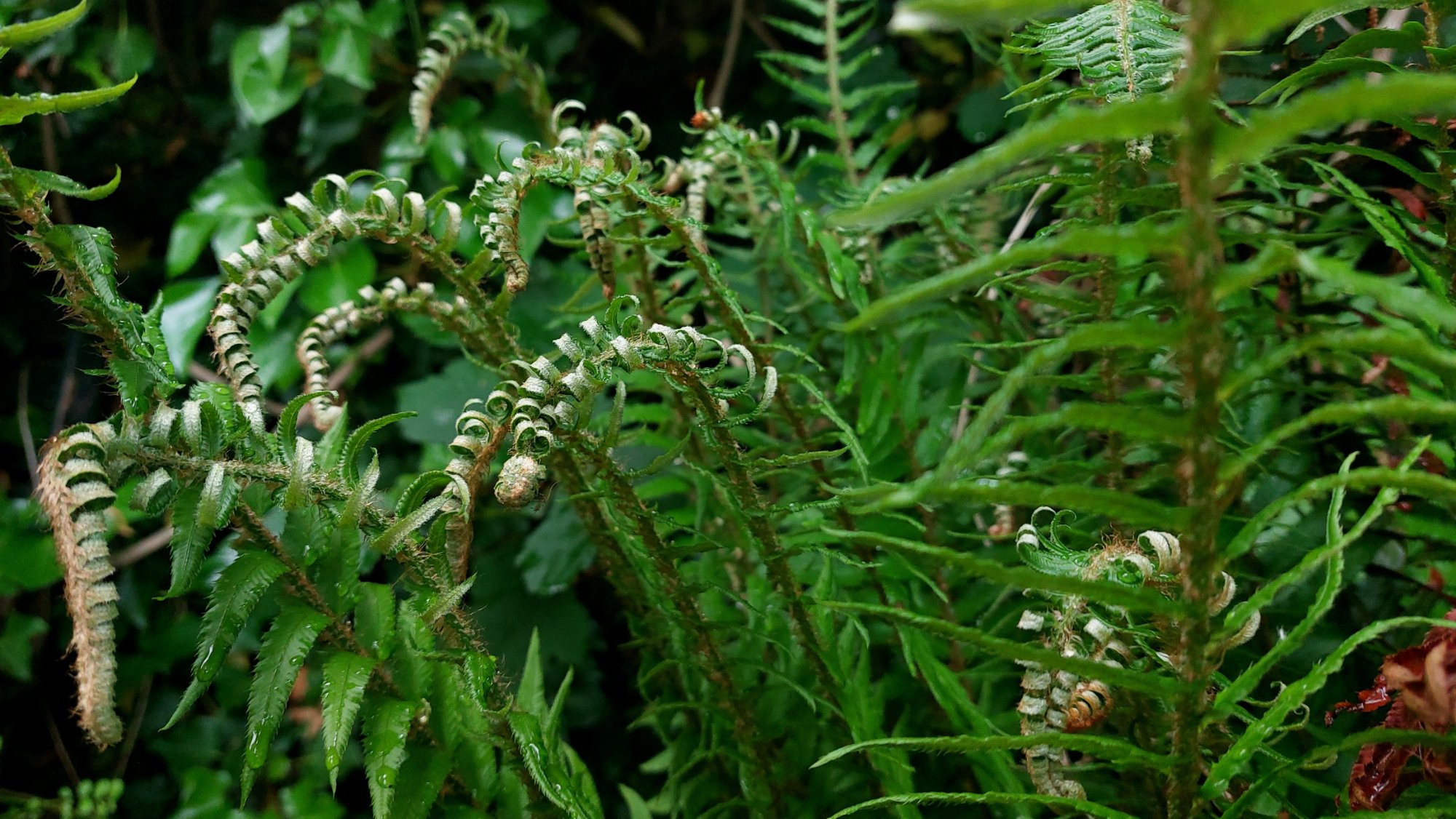 Amerikanischer Schwertfarn - Polystichum munitum . Die sich entrollenden Wedelspitzen sehen aus wie frisch gehobelt.