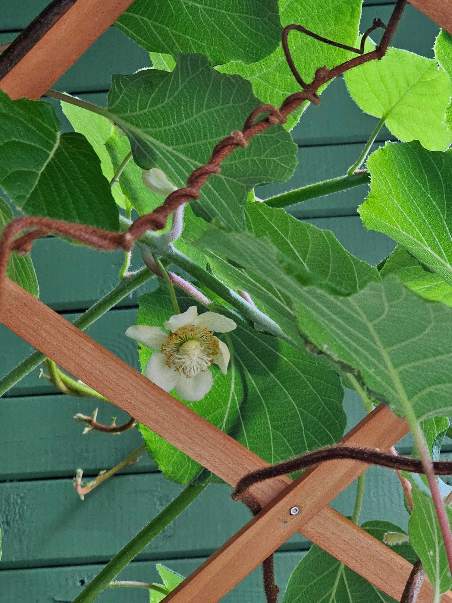 Meine weibliche Kiwi Hayward ist von der Baumschule Horstmann. Ich hoffe dieses Jahr sehr auf Früchte! Sie ist wirklich gut gewachsen, ähnlich wie das Männchen (Tomuri von Pflanzen Kölle). Ein selbstbefruchtendes Weibchen (auch von Kölle) ist nicht angegangen (Solo glaube ich). Ich hatte eigentlich 4 Pflanzen geplant (noch eine rote) und auch dafür vier große Mörtelkübel mit Bewässerung oben auf den Südbalkon gestellt. Jetzt bin ich froh, dass ich nur auf jeder Seite eine Pflanze habe. Die Pergola ist quasi voll und die Lianen strecken sich schon in den Himmel. Die Größe habe ich unterschätzt.