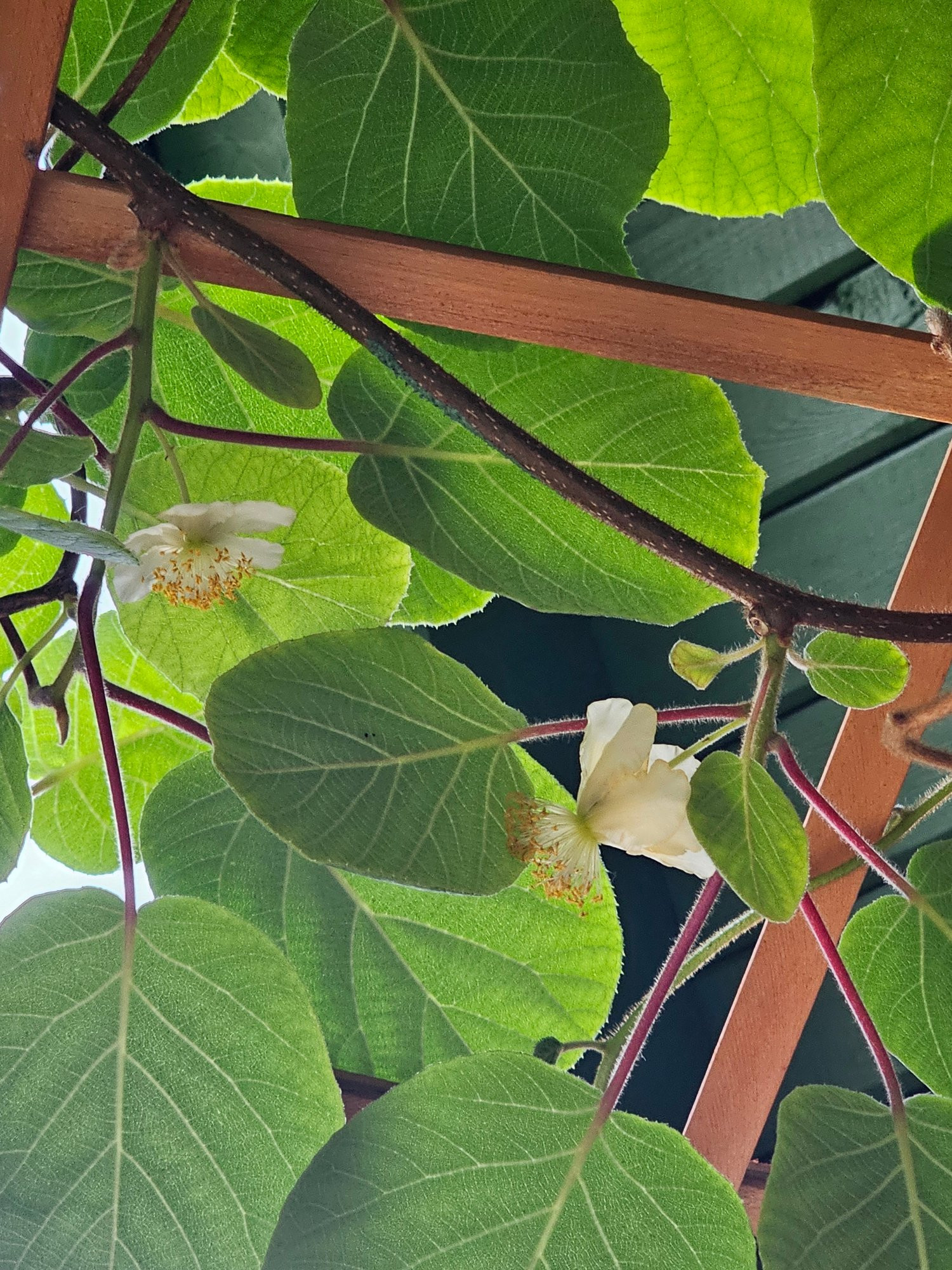 Genau das mit dem konsequenten Schnitt war der Plan. Die mehrlagigen Kiwihöhlen über der Terrasse machen zum pflegen und ernten mehr Arbeit als der konsequente Schnitt. Außerdem sieht es besser aus wenn einem die Früchte von der Decke wachsen, der restliche Garten ist eh schon dschungelig und wild genug.