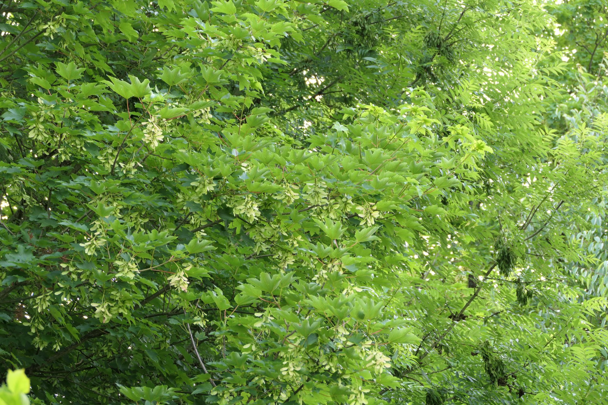 Hier zwei Bergahorne nebeneinander, links mit rosa, rechts mit grünen Samenständen: