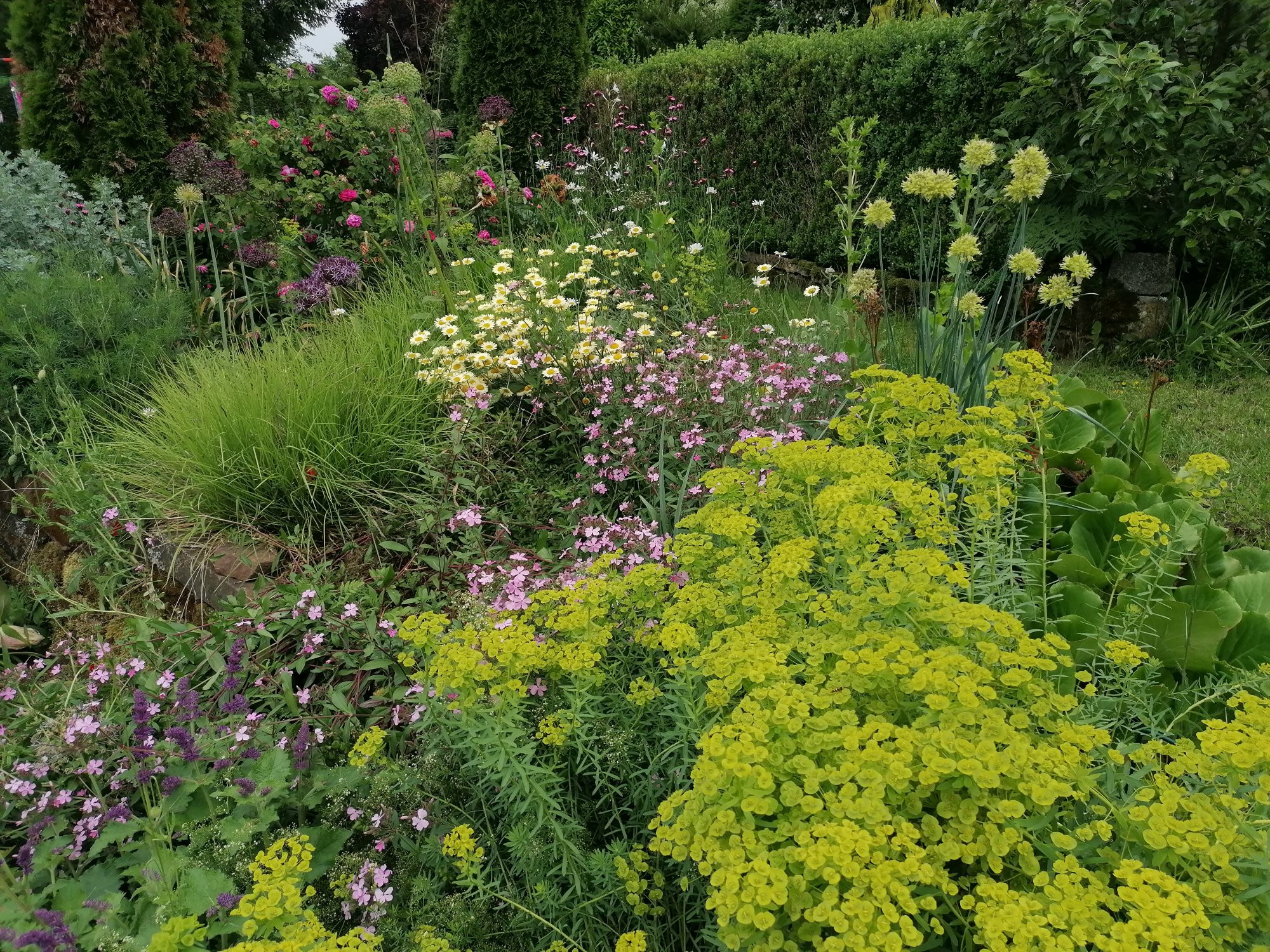 Vermutlich habe ich noch jemanden vergessen. Und fast nichts davon habe ich gepflanzt, aber manche Pflanzen an den Rand gesetzt, damit sie sich aussäen, z.B. das spanische Gänseblümchen, das ist aber der Übermacht der Glockenblumen nicht gewachsen. Das eine oder andere Geum urbanum versucht es auch, wird aber nicht geduldet.