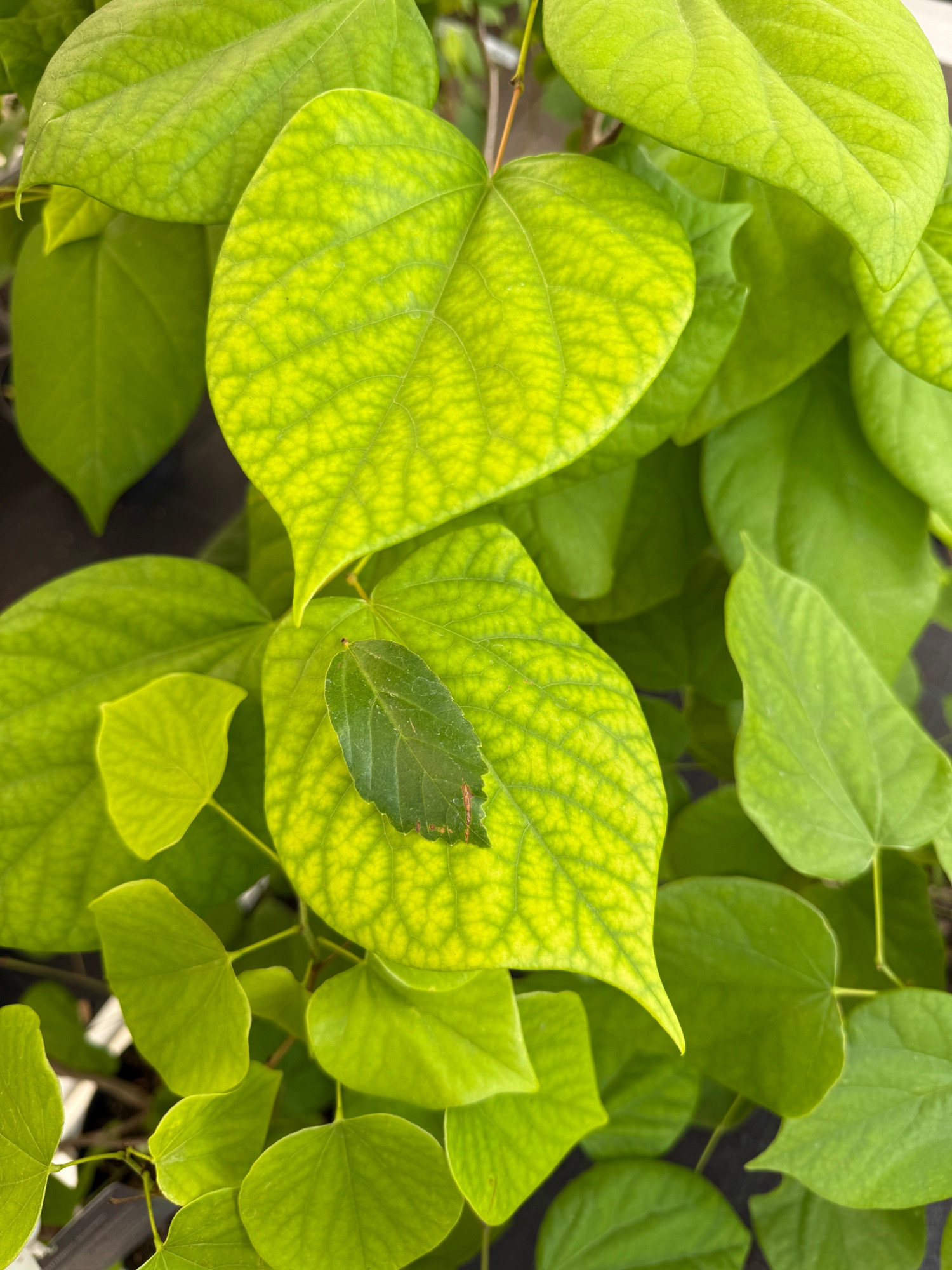Ich habe mittlerweile das Gefühl, das Cercis Avondale mithilfe einer infizierten Pflanzen in der Vermehrung ist, denn auch verkaufsfertige Pflanzen im Gartencenter wirken nie richtig gesund auf mich oft haben sie Grüne Blattadern und sind dann hellgrün bis leicht chlorotisch: Das kann ja dann Eisenmangel, zu hoher PH, Mangan-Mangel, zu nasser Boden oder entsprechende Pathogene sein, die bspw die Nährstoffaufnahme über Wurzelschädigung beeinflussen.
