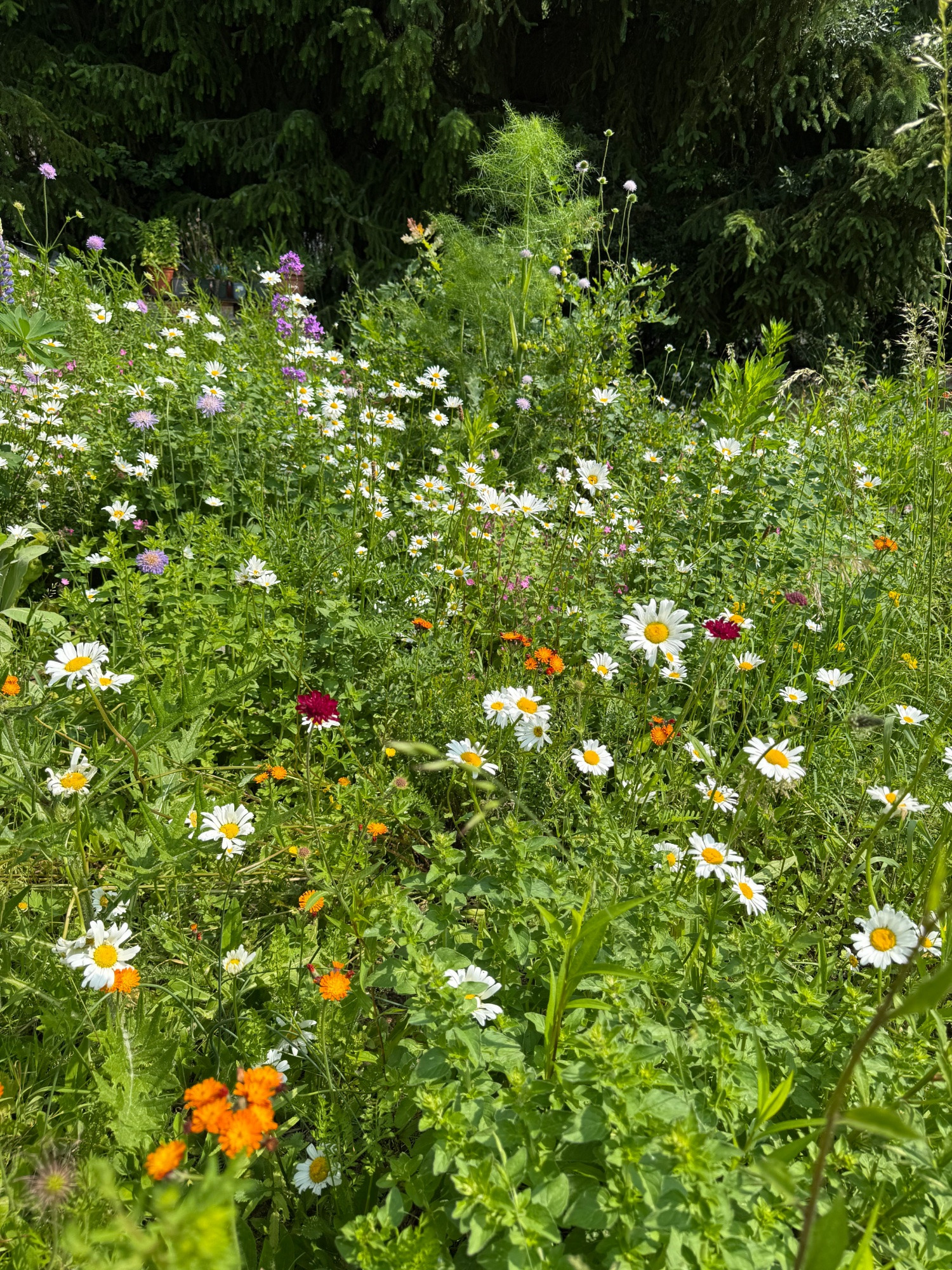 In dieser wilden Fläche die tatsächlich mehr Struktur hat, als man auf den ersten Anblick glauben mag, blühen aktuell einige Knautia in unterschiedlichen Farbtönen.