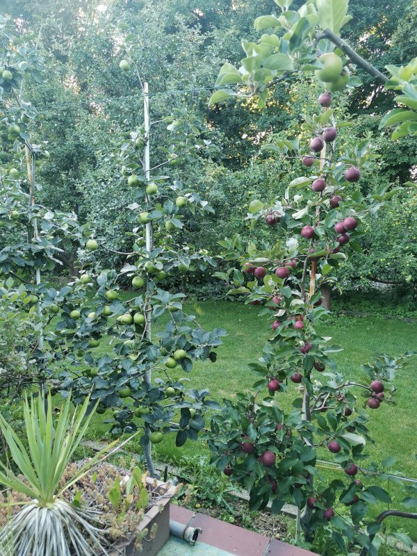 Die Dinger stehen auf M9, Sorten sind Gravensteiner und Roter Berlepsch. Die einjährigen Veredelungen haben vorletztes Jahr bereits gefruchtet, letztes Jahr habe ich endgültig verpflanzt, danach Totalausfall wegen Blütenfrost. Heuer dank verzögerter Blüte guter Fruchtansatz. Höhe momentan etwa 2 Meter. Was mir bei dem einen Exemplar nicht gefallen hat war, dass er kurz unter der Triebverlängerung eine deutliche Krone ausbilden wollte. Darunter ist eine Lücke, da sind auf eine Länge von etwa 30 cm keine Knospen ausgetrieben. Da bin ich am Überlegen ob ich kerben soll, wobei ich nicht einschätzen kann ob die schlafenden Augen wegen zurückliegendem krassem Blütenfrost überhaupt noch intakt sind.
