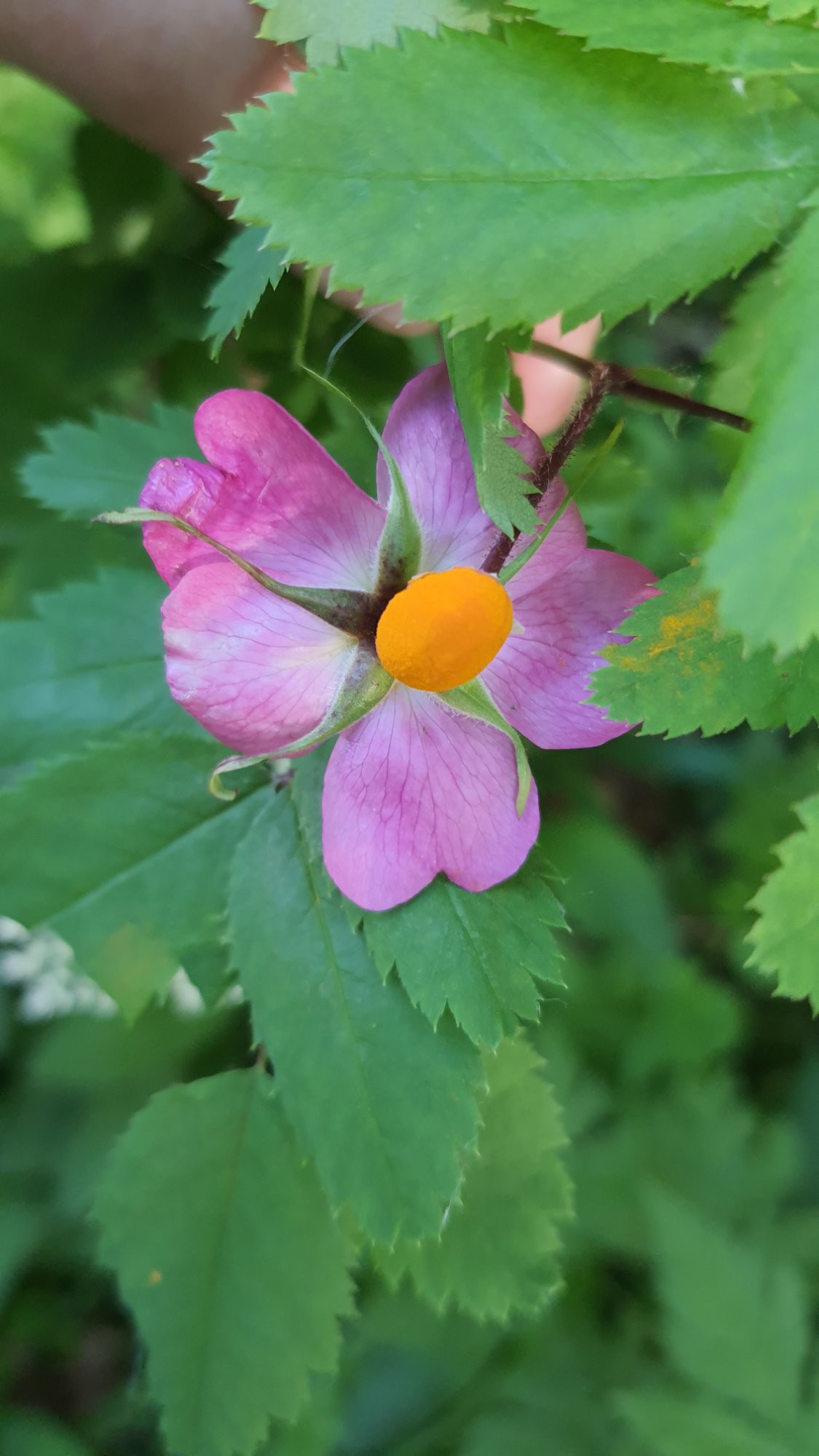 Das orange Kissen befindet sich auf der Rückseite einer wild wachsenden Rose.