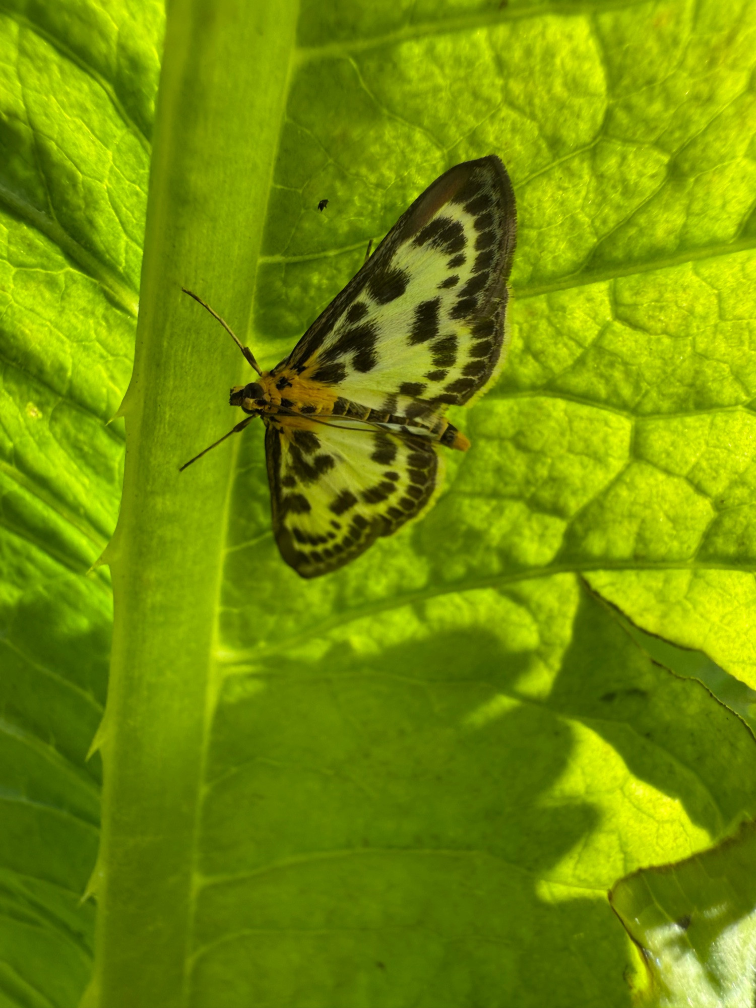 Hier sehe aktuell mehr der unscheinbaren Kandidaten, wie diesen Graubinden-Labkrautspanner: Oder diesen Brennnesselzünsler der sich unter dem Blatt einer Karde versteckt: Einer der sympahterischeren Zünsler