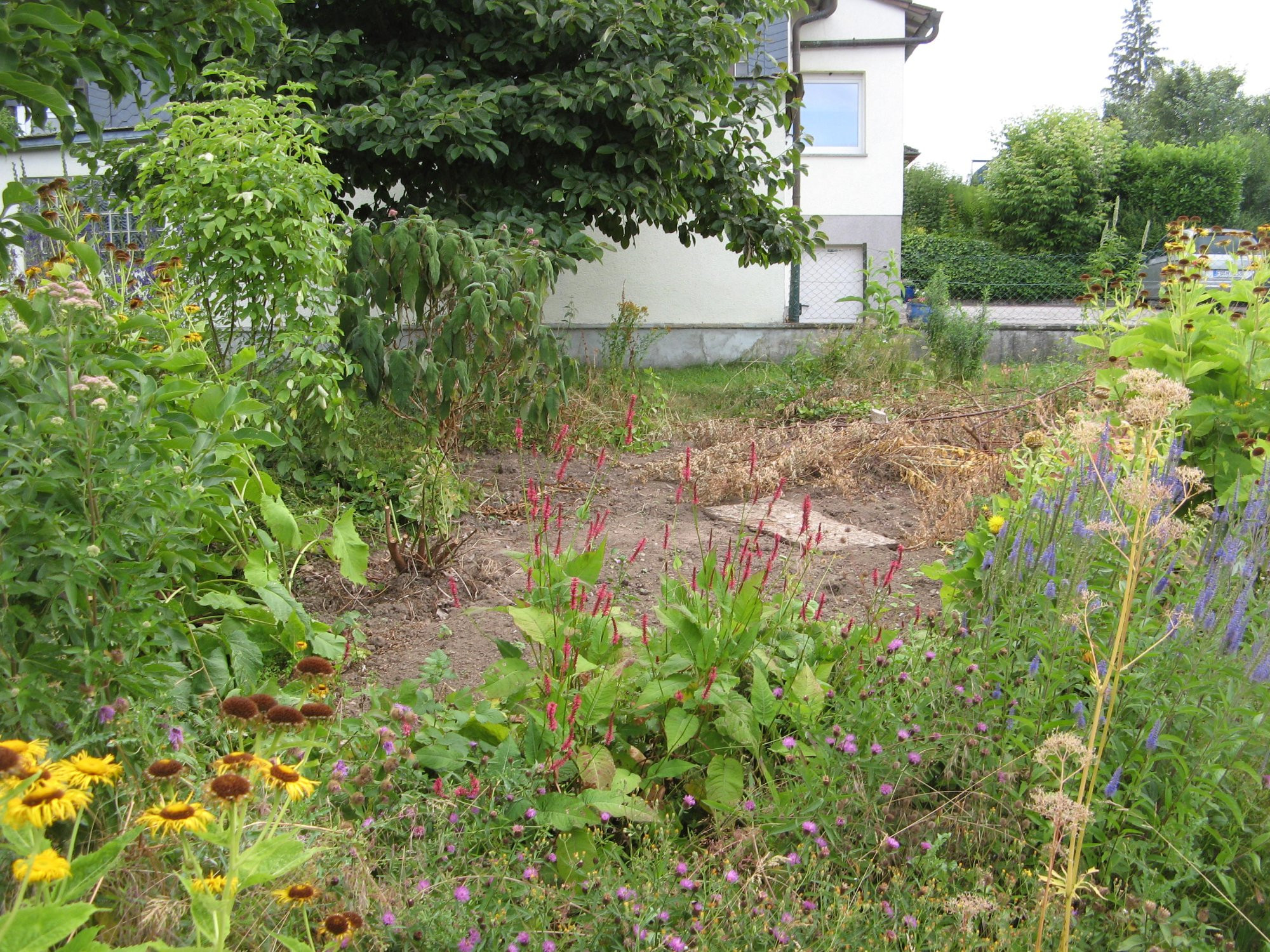 einen echten Problemort in der Staudenwiese hab ich noch. Erst wuchs dort wegen Beschattung außer Bärlauch, blauer Eisenhut und Brennnesseln durch 3 sich immer imens aussäenden sehr großen (ca. 25 jährigen) europäischen Pfaffenhütchen nicht wirklich was. Dann wurde davon 2 diesen Winter gefällt, die Stümpfe ausgebrannt (das 3. folgt mit der großwüchsigen vollkommen fehlausgezeichneten Magnolie im Hintergrund Bild 3 nächsten Winter) im Frühjahr die einst darunter wachsenden großen Brennnesselbestände/Pfaffenhütchenjungwuchs komplett entfernt, vorgezogene Stauden gesetzt, "Bauerngartenblumen" dazwischen gesät und seitdem wächst da trotz der Trockenheit imenses bis > 2m hohes gelbblütiges "Unkrautwerch" (Kohl- und anderes gelbblütige einjähriges "weiche" distelartige, Stachellattich, indisches Springkraut - wie das da nur hin gekommen ist, gibt in weitem Umkreis keins