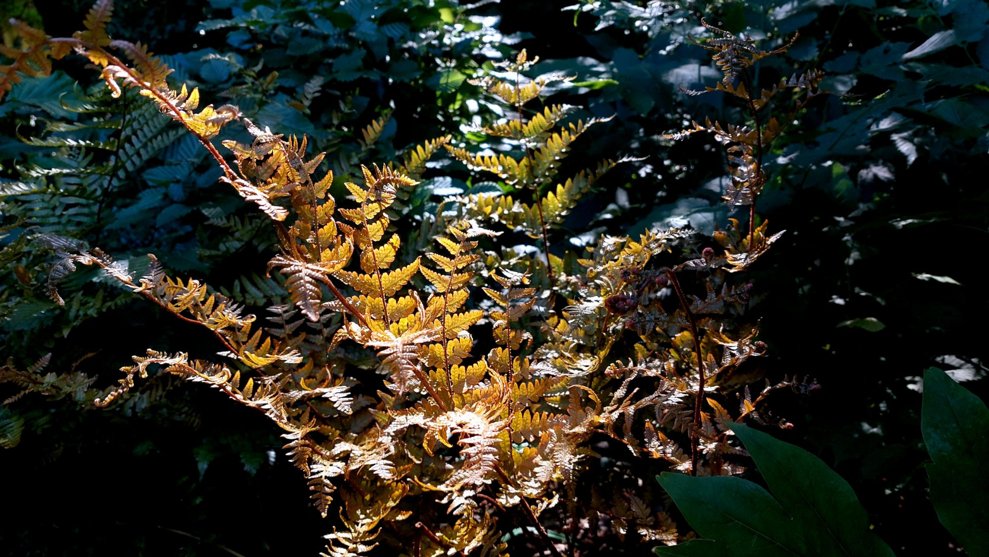 Wenn die Sonne sich in den Schattengarten hereinschleicht - Rotschleierfarn.