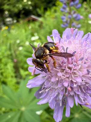 Am Natternkopf entdeckte ich einen ganzen Pulk von Wildbienen und befragte, da selber leider unfähig, Obs-Ident, was das denn ist. Ergebnis: die Glänzende Natternkopf-Mauerbiene. Wie der Name vermuten lässt, findet man die an natürlichen Natternkopf-Beständen. Außer in meinem Garten am Straßenrand wüsste ich aber in der näheren Umgebung keinen weiteren Natternkopf. Möglicherweise gibt es Ansaaten auf Verkehrsinseln o.ä. in etwa 6 -10 km entfernten Orten, vielleicht auch vereinzelt in den eher dünn gesäten Naturgärten der Gegend. Hat mich doch überrascht, dass da ein ganzer Trupp zu meinen paar (vielleicht ein Dutzend) Natternköpfen gefunden hat bzw. sich bereits bei mir vermehrt hat. Bei den Nistplätzen sind die wohl nicht so heikel, da finden sie hier schon was.