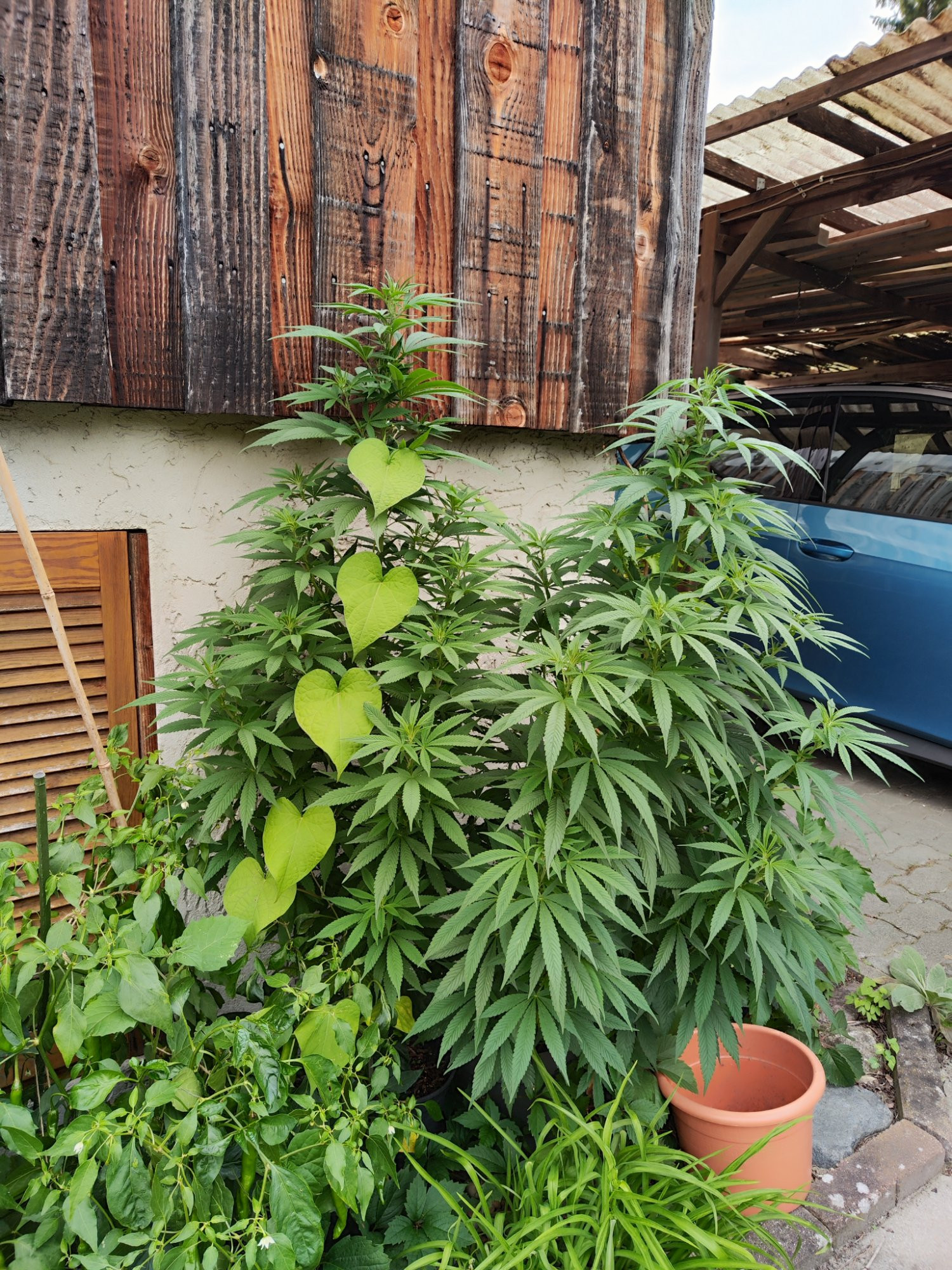 In echt sind die Blätter dunkler. Die standen auch bis vorgestern im 3 Litertopf und sind gerade in die 15-20 Liter mit Komposterde umgezogen. Aber ich werde mal drauf achten. Mir geht’s nicht um die Ernte und ich könnte sonst auch noch ein paar Körnchen nachlegen. Meine frisch gesäte Amnesia CBD hat mir leider ne Maus oder Schnecke weg gefressen, die hätte ich mal noch etwas länger im Regal wachsen lassen sollen.