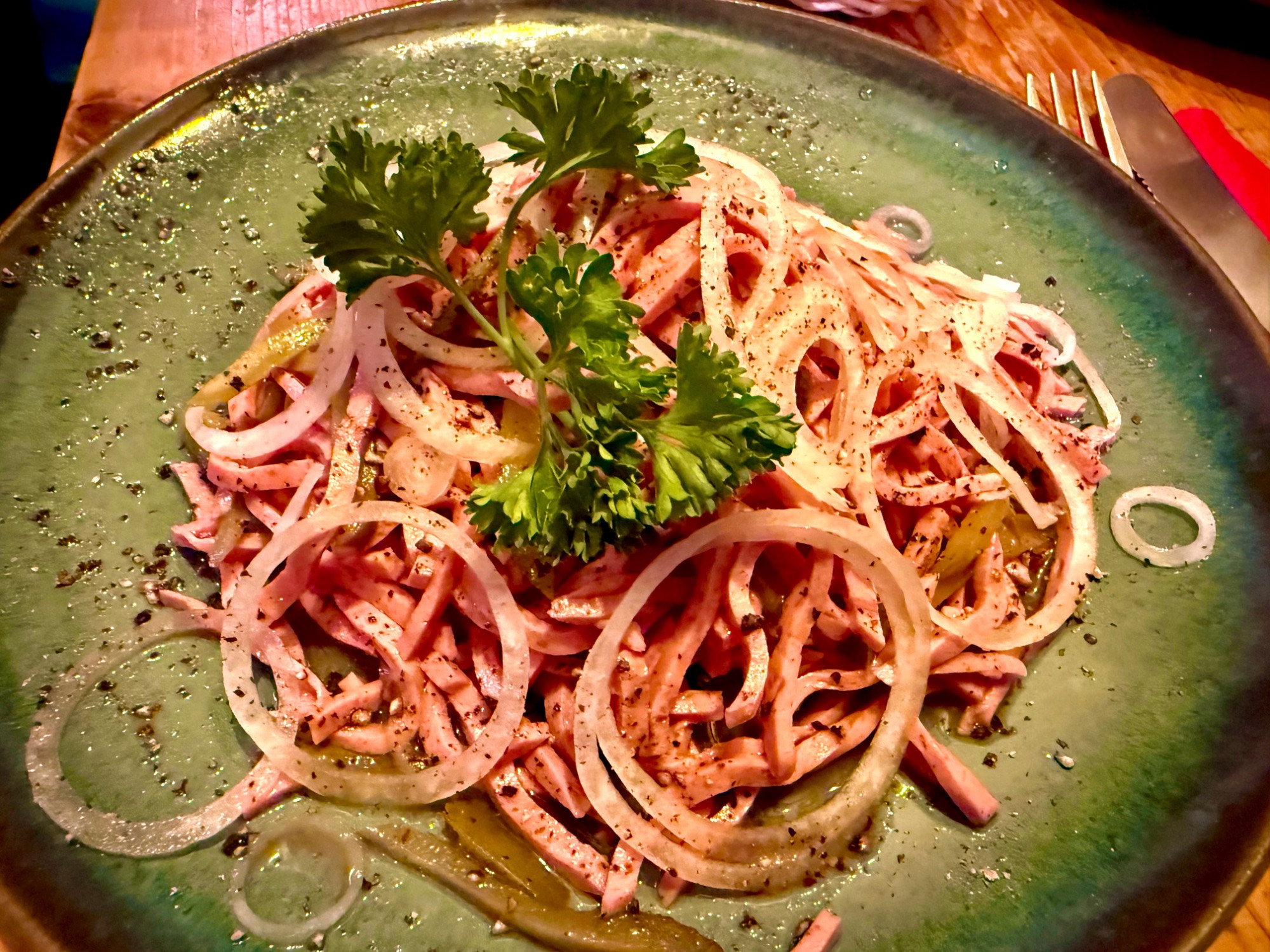 Also, ich seh keine Zwiebelringe? Dafür aber Eier, die in einen Schweizer Wurstsalat eigentlich nicht reingehören.