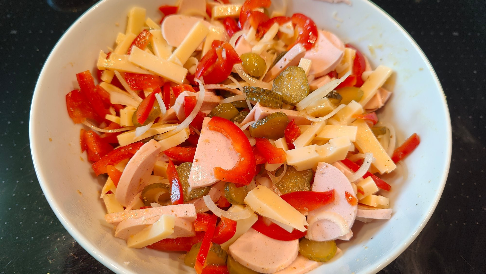 . Vegetarische "Fleischwurst", Paprika, Emmenthaler, Zwiebel und Essiggurken. Angemacht mit Essiggurkenwasser, Weißweinessig, Öl, süßer und scharfer Senf, Salz und Pfeffer. Ich merk keinen Unterschied zu "echter" Fleischwurst, hab aber seit über 30 Jahren auch keine mehr gegessen