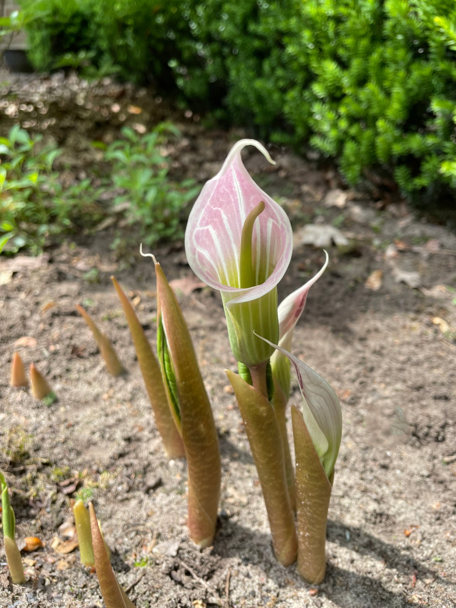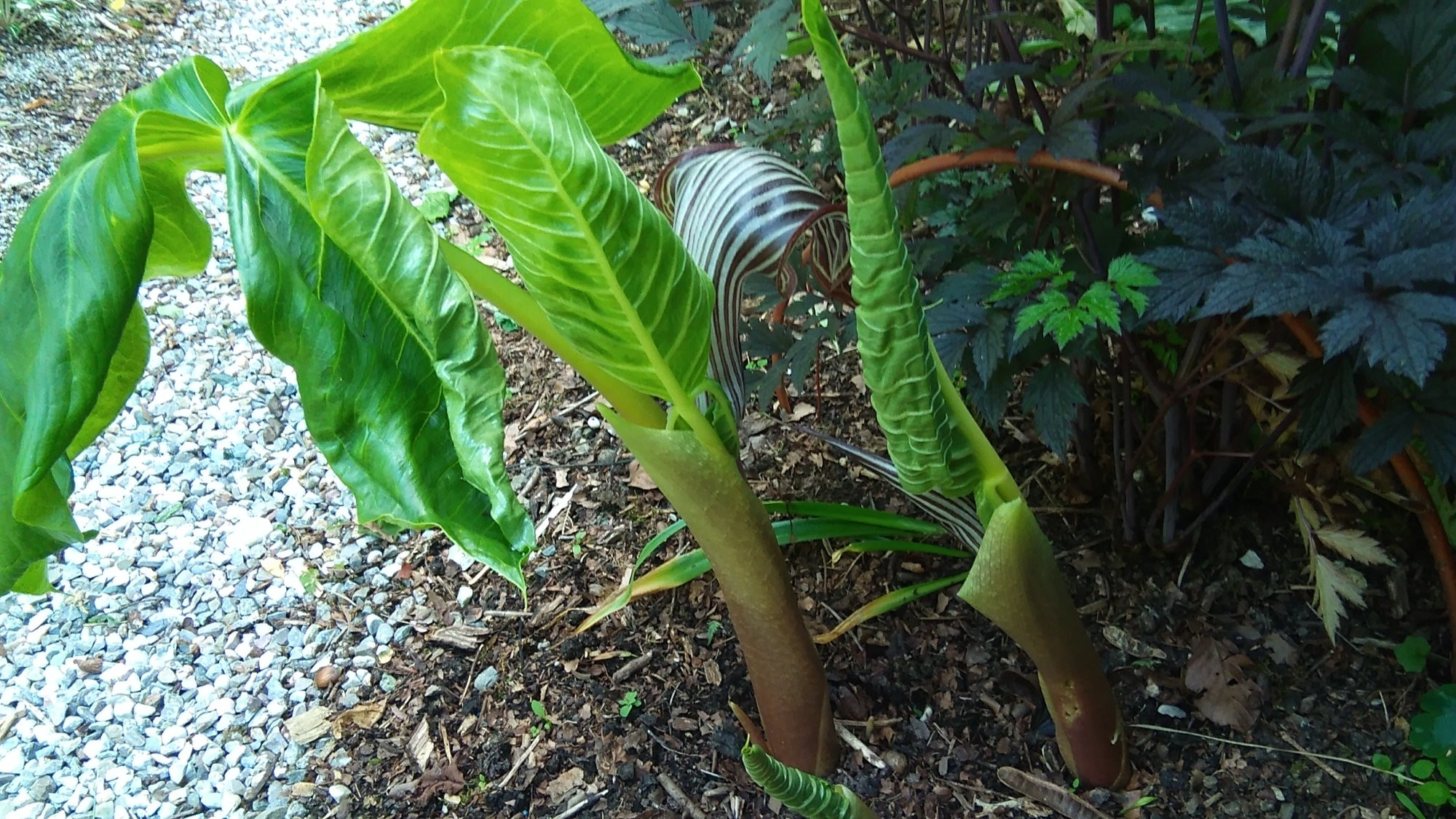 Schnell ein Bild gemacht bevor die Schnecken die Blüte ruinieren: Arisaema candidissimum