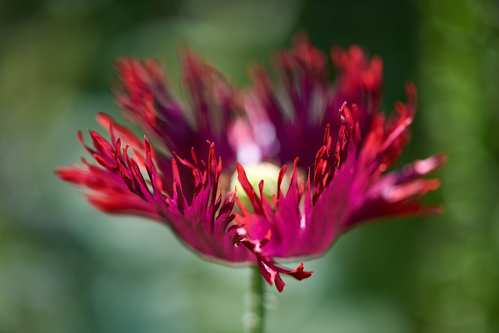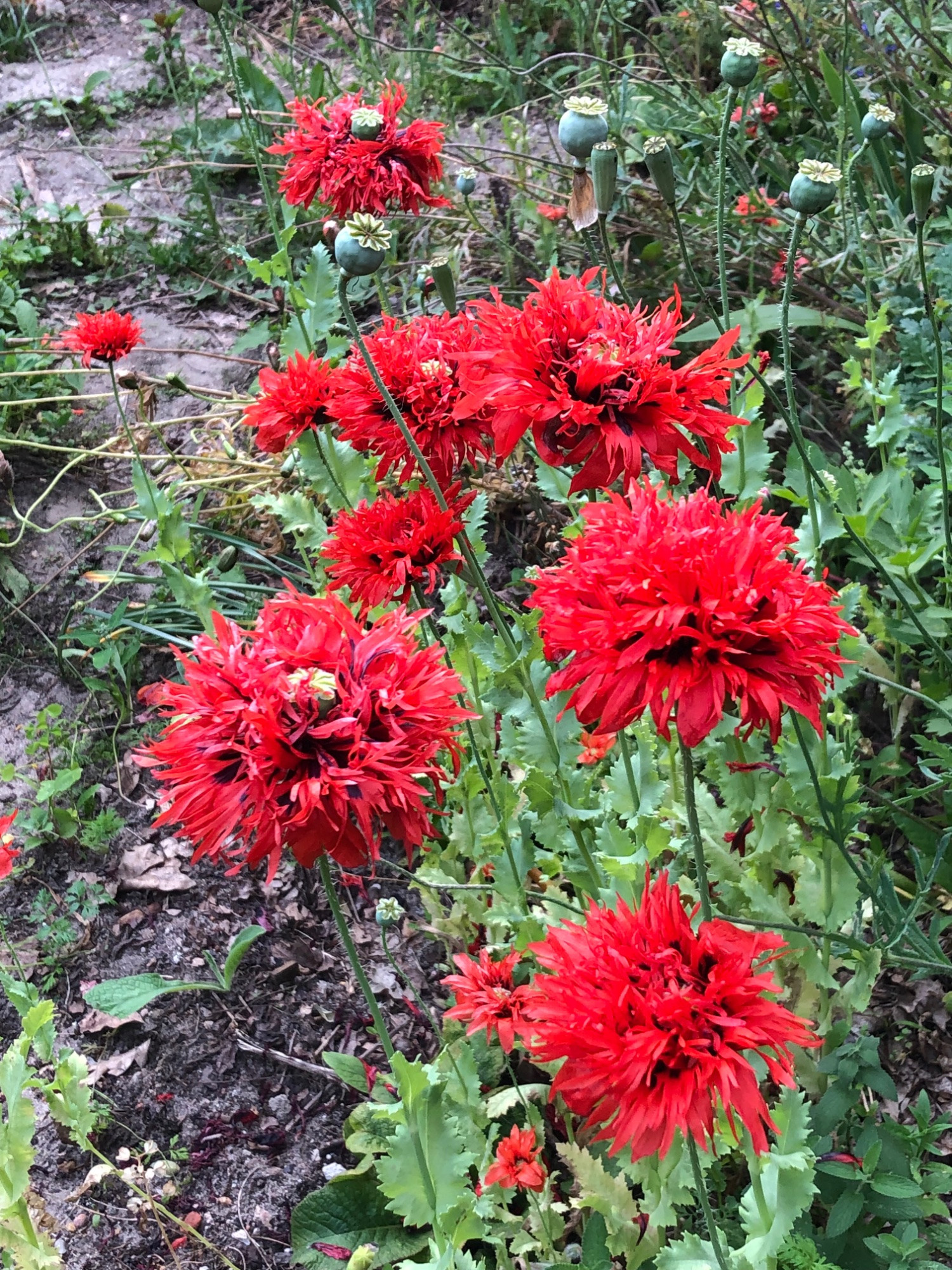 Hier puschelt es auch fransig und knallrot. Papaver Somniferum, der sich hier ringsum vermehrt hatte. Ich hab letztes Jahr einfach gemischte Saat verteilt und das kam raus. Leider weder lila, noch rosa, obwohl ich den hier toll finde.