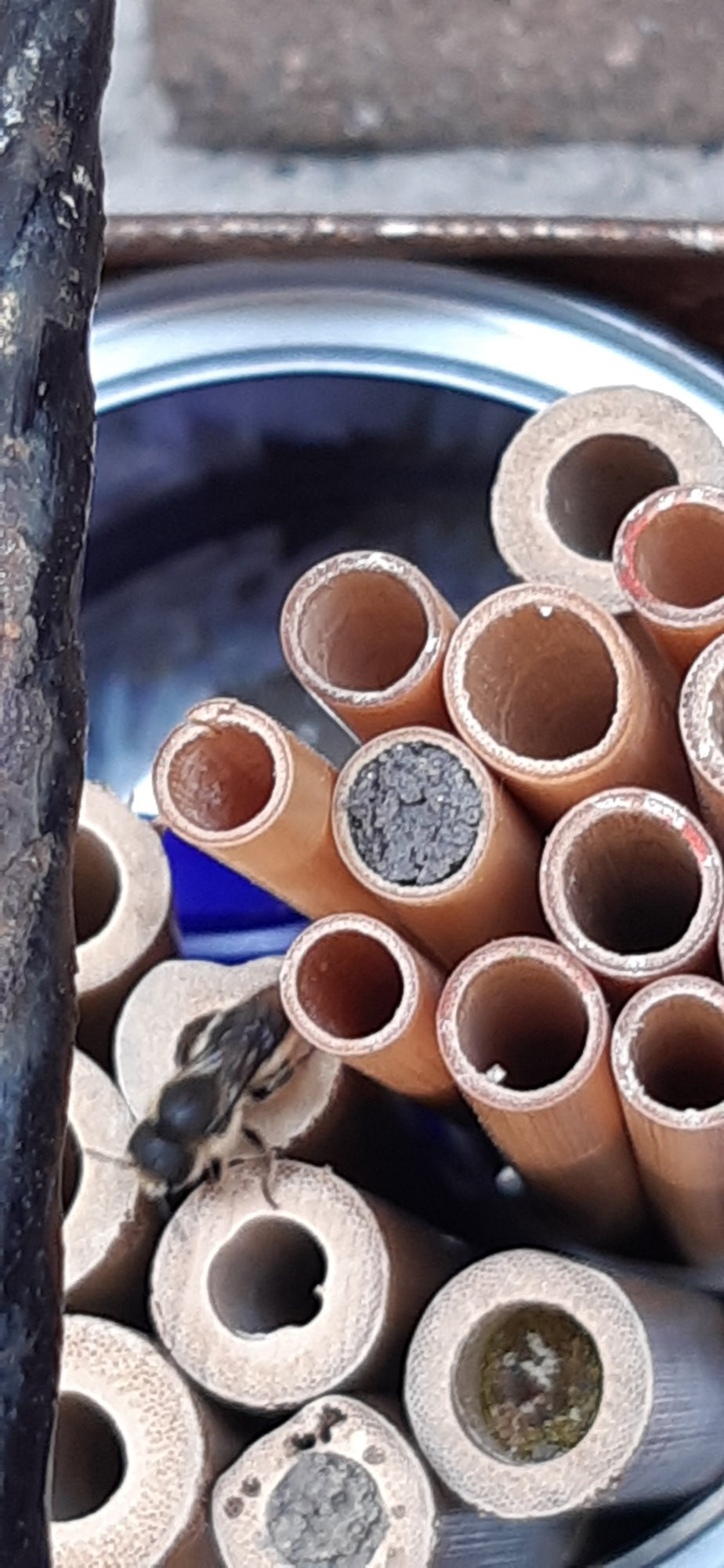 Komischerweise gehen sie nur auf die hohe , 170 cm angebrachte Nisthilfe. In der anderen, welche unter am Boden stehen, nisten die Mauerbienen völlig ungestört.