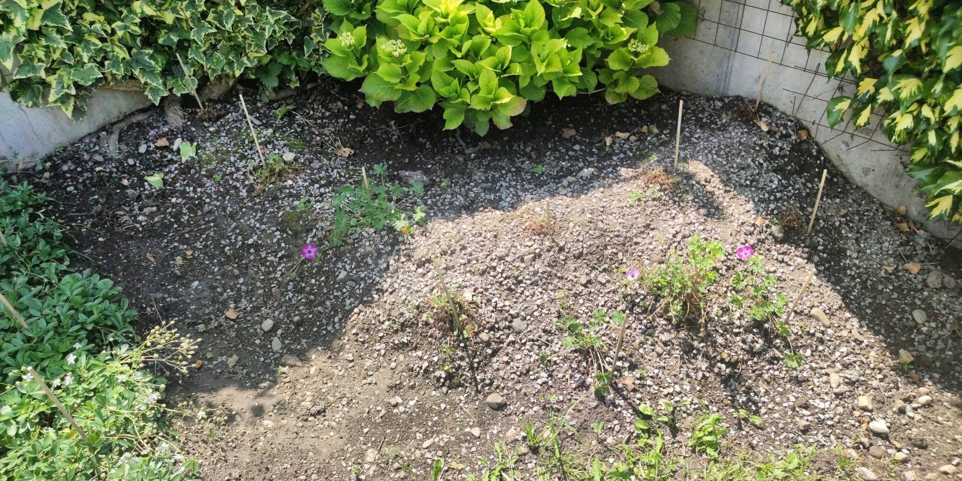 Da sollten also 11 Geranium cinereum mit Pfahlwurzeln vor einer alten Bauernhortensie sein. 6 Ballerina direkt oben vor der Bauernhortensie, 3 Ballerina auf halber Höhe und 2 Lilac noch ein weiter nach unten.