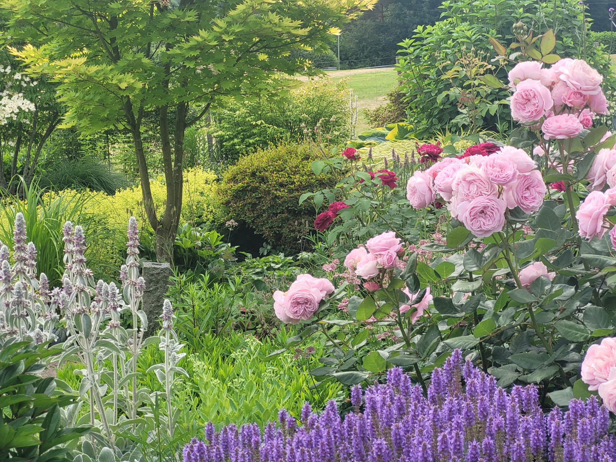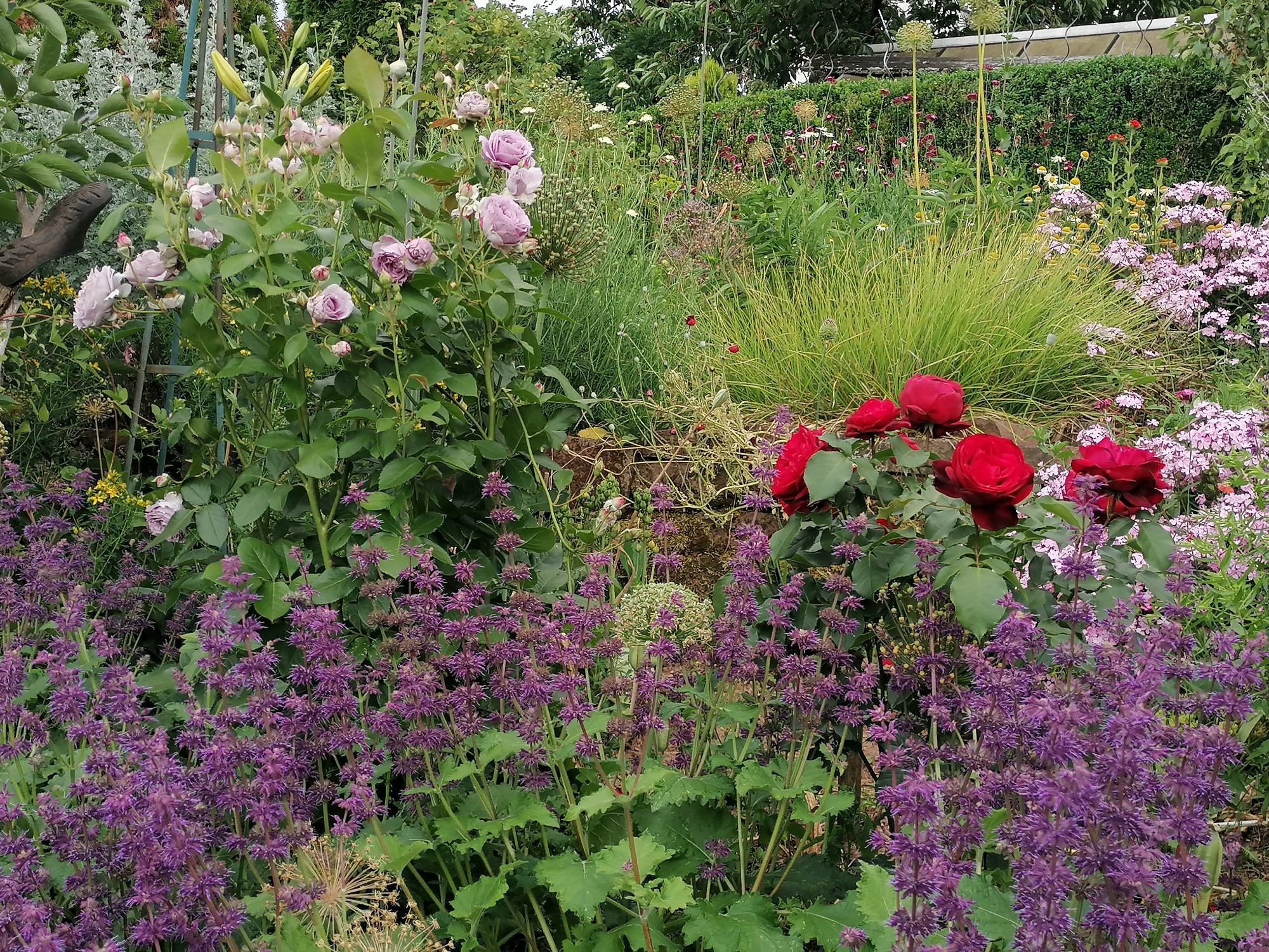 Die Rosen vertragen ja eingewachsen gut Trockenheit. 'Admiral' in tiefrot und 'Novalis' in morbidem Magentagrau begeistern beide. Gesund und blütenreich, die Admiral hat im Gegensatz zu Novalis kein ADR, bekommt spät im Jahr etwas Sternruss.