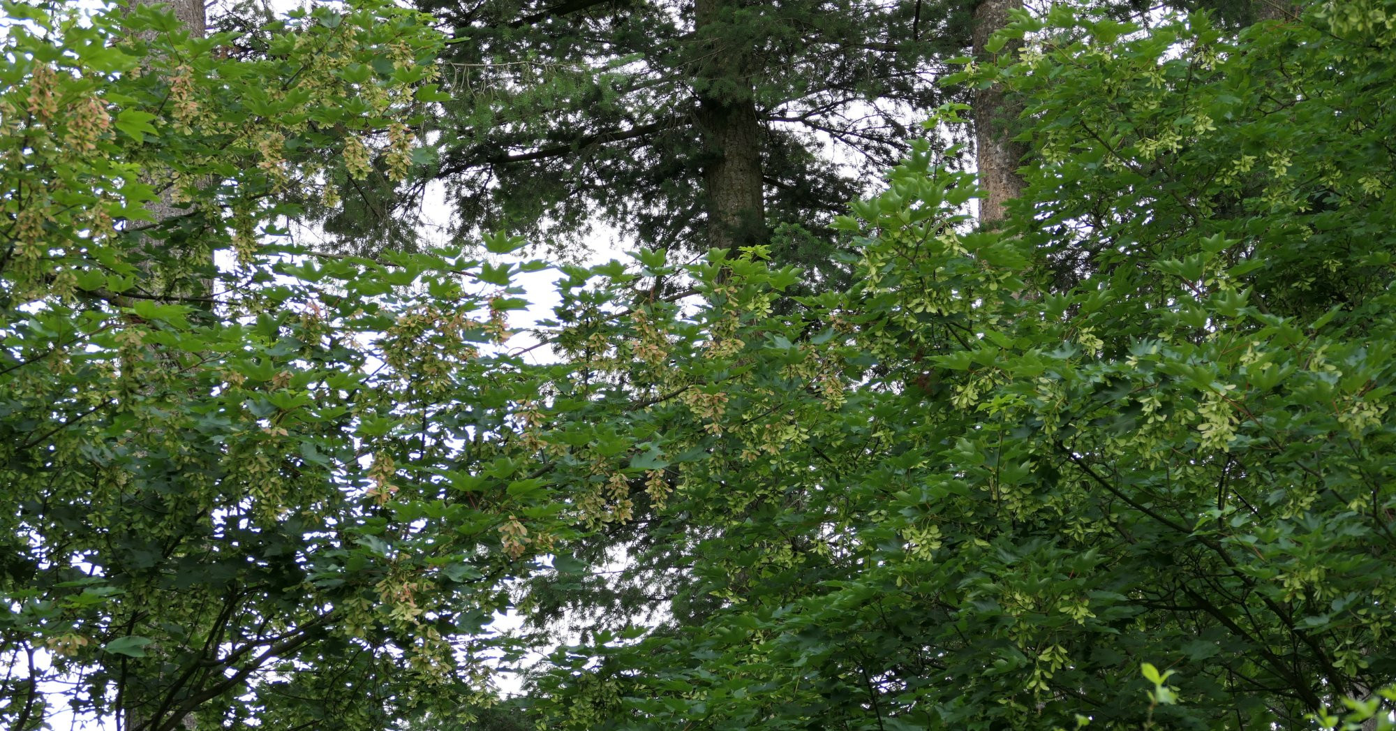 Hier zwei Bergahorne nebeneinander, links mit rosa, rechts mit grünen Samenständen: