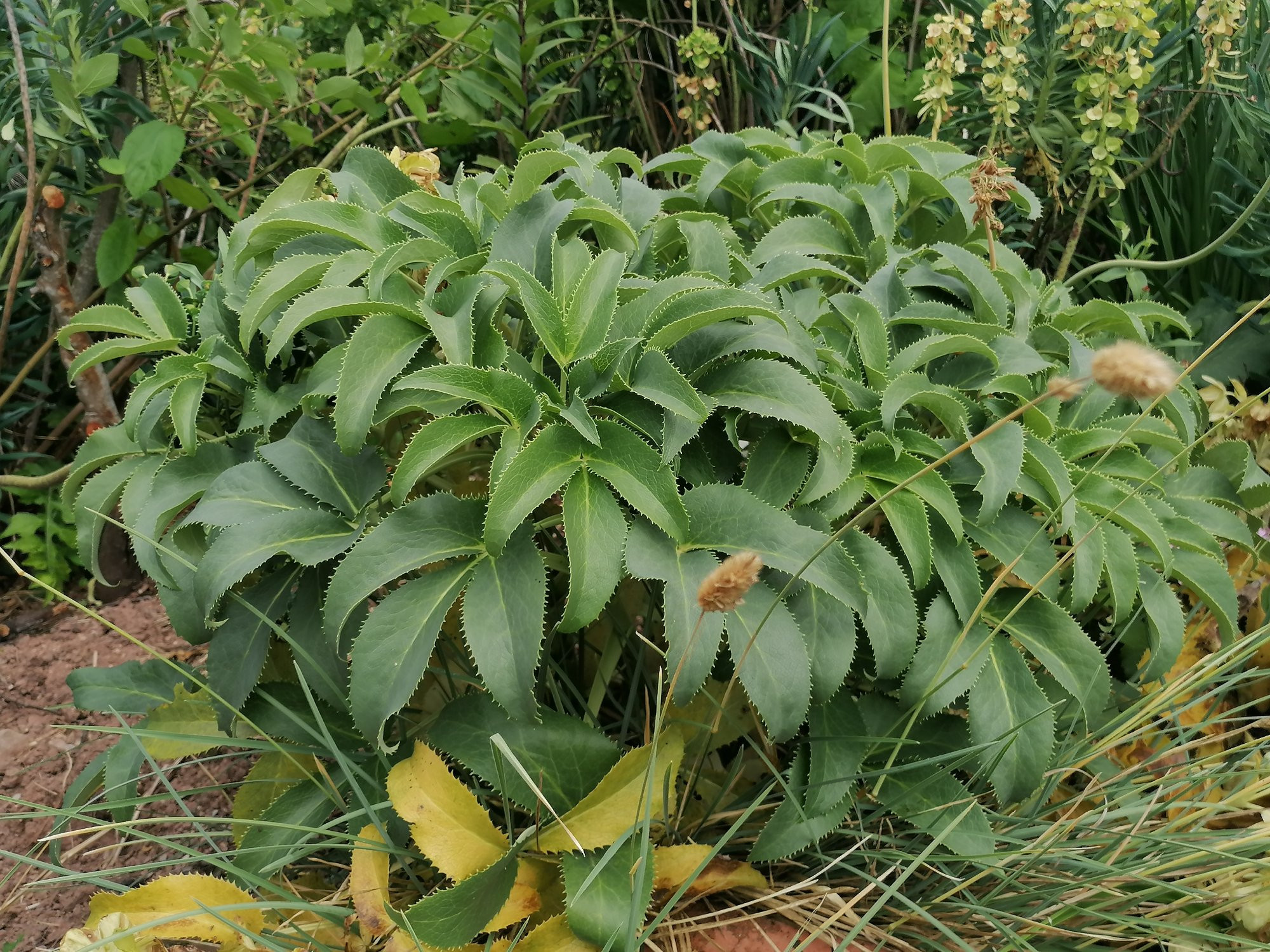 Helleborus argutifolius (Heimat Korsika) steht ornamental da wie eine Eins