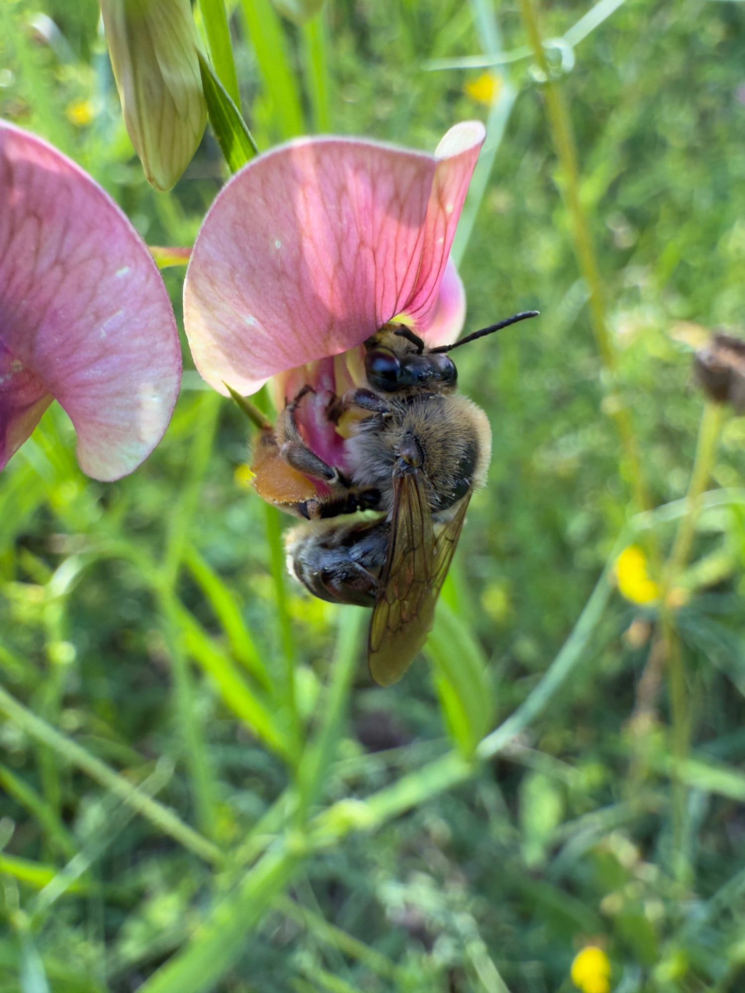 Ich vermute Juni-Langhornbiene ist auf der Vorwarnliste: Sie war sehr stark fokussiert auf Schmetterlingsblütler vorallem Lathyrus sylvestris hat es ihr angetan und Lotus. Trifolium fand sie weniger interessant. Anekdotisch würde ich behaupten sie bevorzugt Fabeae ( Wicken) und Loteae ( Hornklee-Tribus) gegenüber Trifolieae (Klee-Tribus). Der Blütenaufbau der Fabae und Lotae scheint mir etwas stärkere Wildbienen zu begünstigen.