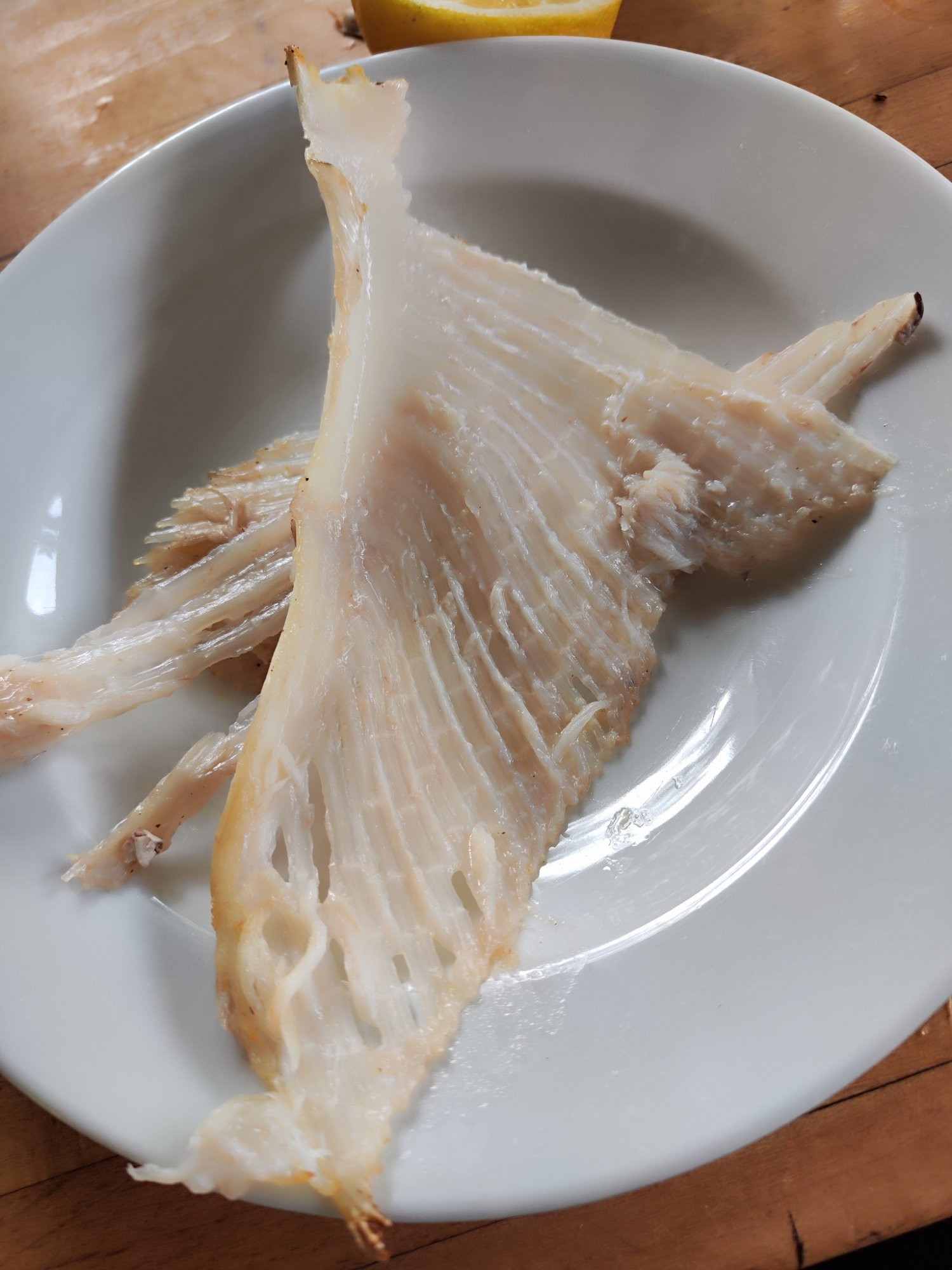 Mein Fischhändler hatte heute Rochen im Angebot. Natürlich konnte ich da nicht widerstehen und kaufte also ein Stück Flosse. Zusammen mit gescheibten neuen Kartoffeln, Zwiebel und Tomaten habe ich es im Backofen gegart.