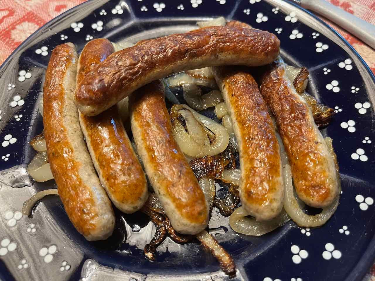 Nürnberger Rostbratwürste auf Zwiebelbett sowie Karoffelpüree mit Frühlingszwiebeln zum Bordeaux supérieur 2014
