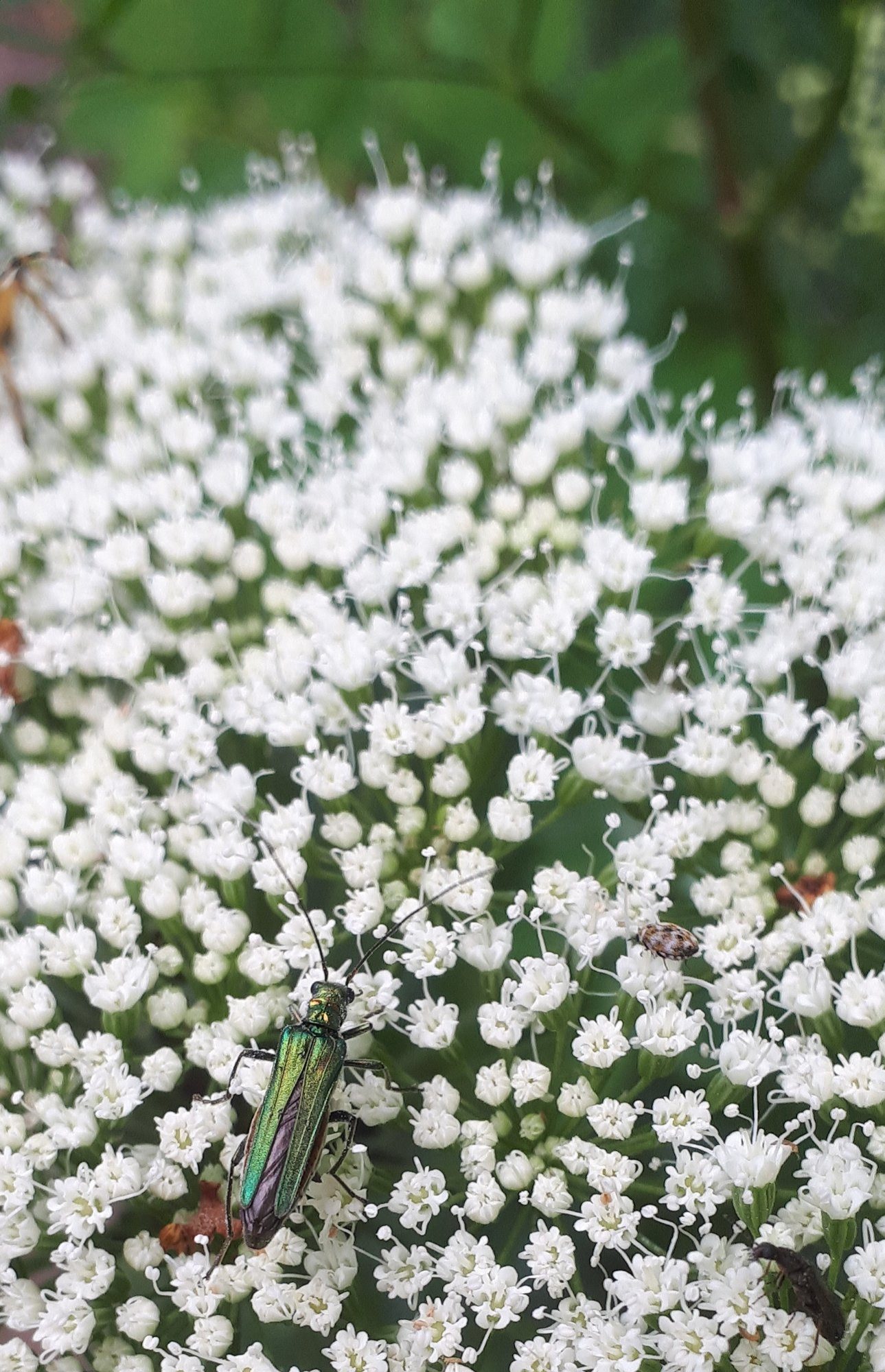 Hier haben Rosenkäfer eine Doldenblüte als Alternative entdeckt. Da dürfen sie sich gerne schmatzend Austoben. Noch weitere Käfer nutzen diese Nahrungsquelle