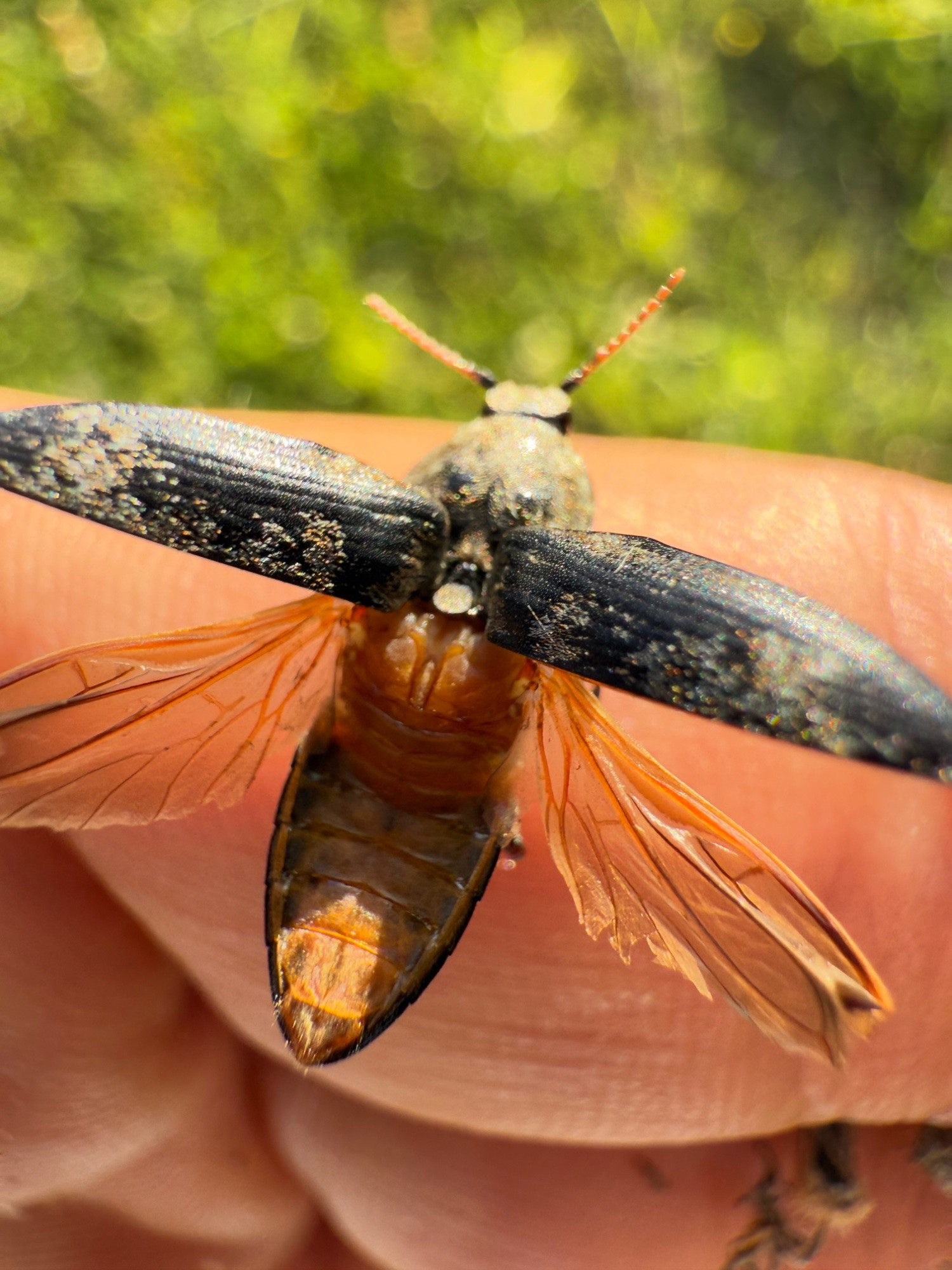 Letzens hatte ich die Hilflosigkeit von Insekten ansgeprochen, wenn sie auf dem Rücken liegen dieser Käfer hat einen Klick"-Mechanismus: Wie alle Schnellkäfer besitzt auch der Mausgraue Schnellkäfer eine faszinierende Fähigkeit. Wenn er auf dem Rücken liegt, kann er seinen Körper schnell biegen und einen Dorn an seiner Unterseite (Prosternum) in eine dafür vorgesehene Grube am Mesosternum schnappen lassen. Dies erzeugt ein deutliches "Klick"-Geräusch und schleudert den Käfer in die Luft, sodass er sich wieder auf die Beine bringen oder einem Feind entkommen kann.