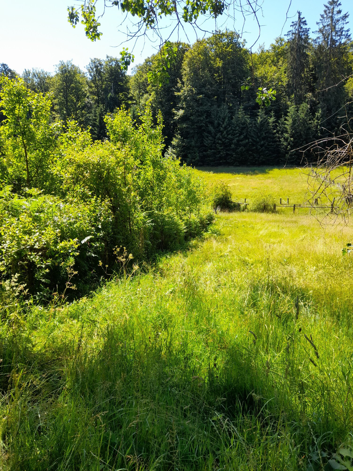 Ab an den Riepenbach. Ruhig bleiben. Ich hab da ja schon mal einen Sonnenstich bekommen. Ja. Ich muss da zäunen. Aber mindestens teilweise liegen die Netze schon.