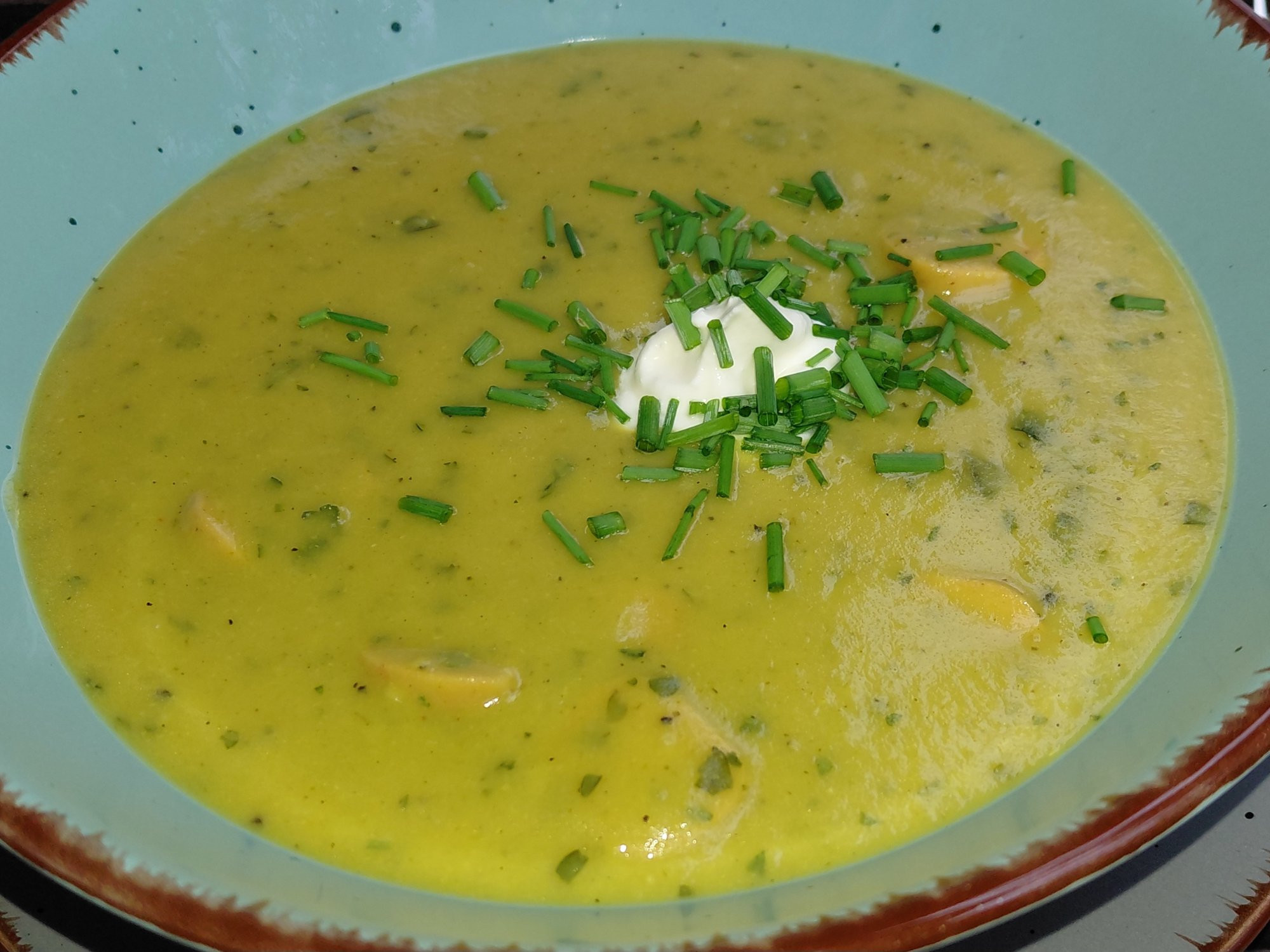 Kartoffel-Brokkoli-Suppe mit vegetarischen Würstchen und Schmand
