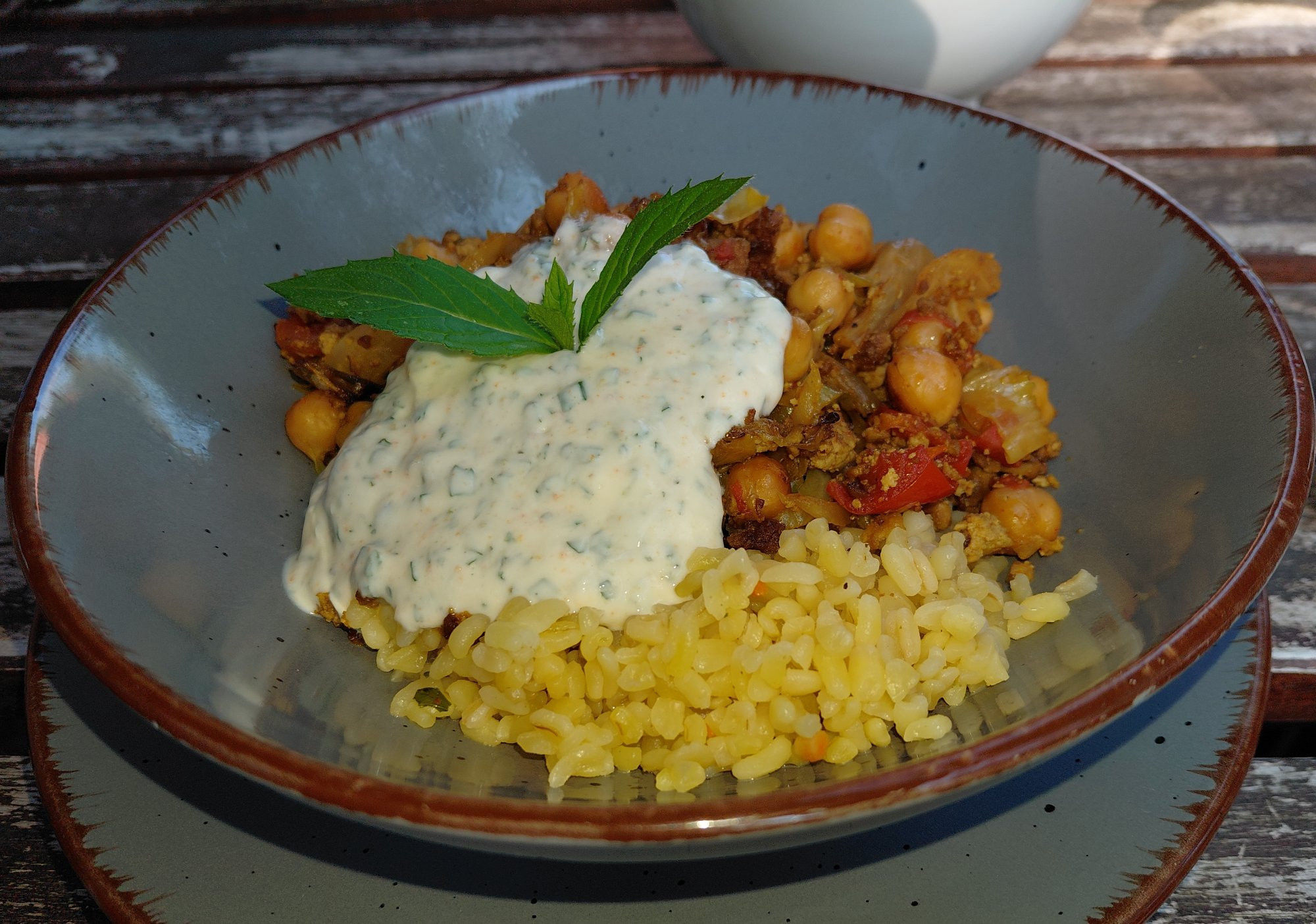 Kicherersen-Spitzkohl-Gemüse mit Bulgur und Joghurtsoße