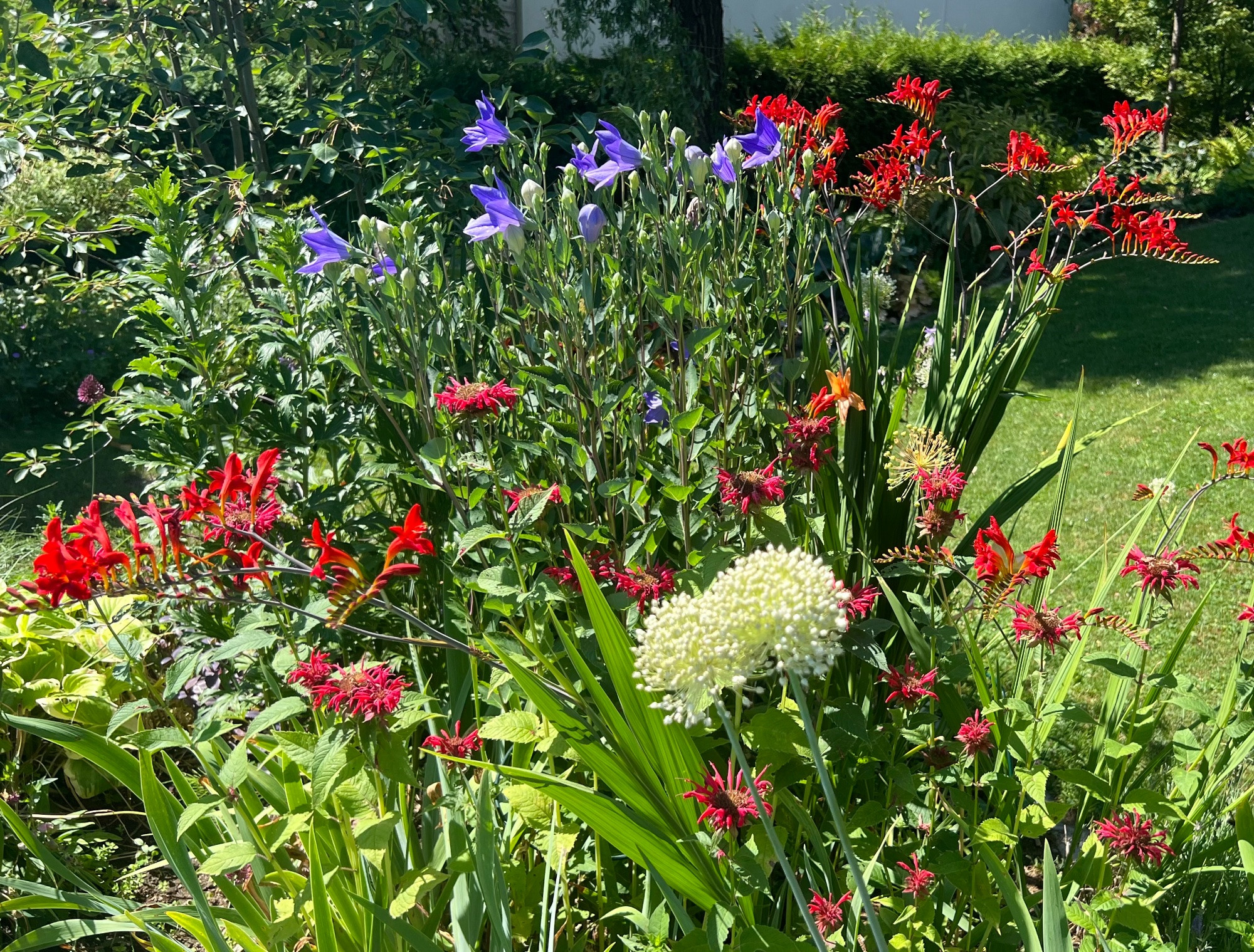 Jetzt bei der großen Hitze sehen noch gut aus: Natternkopf, Sedum acre, Hylotelephium telephium (irgendeine Sorte), Wilde Möhre, Mittagsblume Delosperma cooperi in Sorten, Feige, Lavendel, Rosmarin, Salbei, diverse Thymus, Allium sphaerocephalon, Liguster, ein paar Kriechspindelsträucher, und das meiste, was nah genug am Bach steht, um von dort Wasser abzubekommen. Der Garten gehört zur Zeit den Heuschrecken, Schmetterlingen und Schwebfliegen, denen gefällt anscheinend die Hitze.