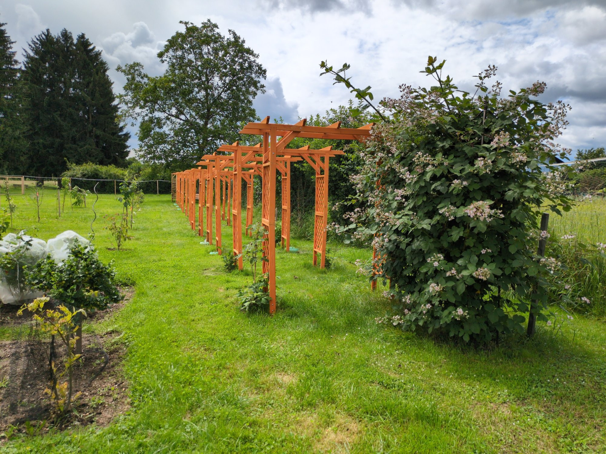 Außer Brombeeren gibt es noch Passionsfrüchte, Japanische Weinbeeren, Akebia, Wein, Minikiwis und große Kiwis. Die Bilder sind von letztem Jahr nachdem wir den Gang fertig gestellt hatten. Einige der letztes Jahr gepflanzten Pflanzen haben schon die volle Höhe der Bögen erreicht. Es gibt aber noch zwei Lücken für Weinpflanzen die wir aus unserem Wiener Garten veredeln haben lassen um die Sorten übersiedeln zu können. In weiterer Folge ist geplant, je zwei Bögen oben mit Holzlatten miteinander zu verbinden, damit die Pflanzen den Platz zwischen den Bögen ausnutzen können und ein grünes Dach bilden von dem die Früchte runter hängen.