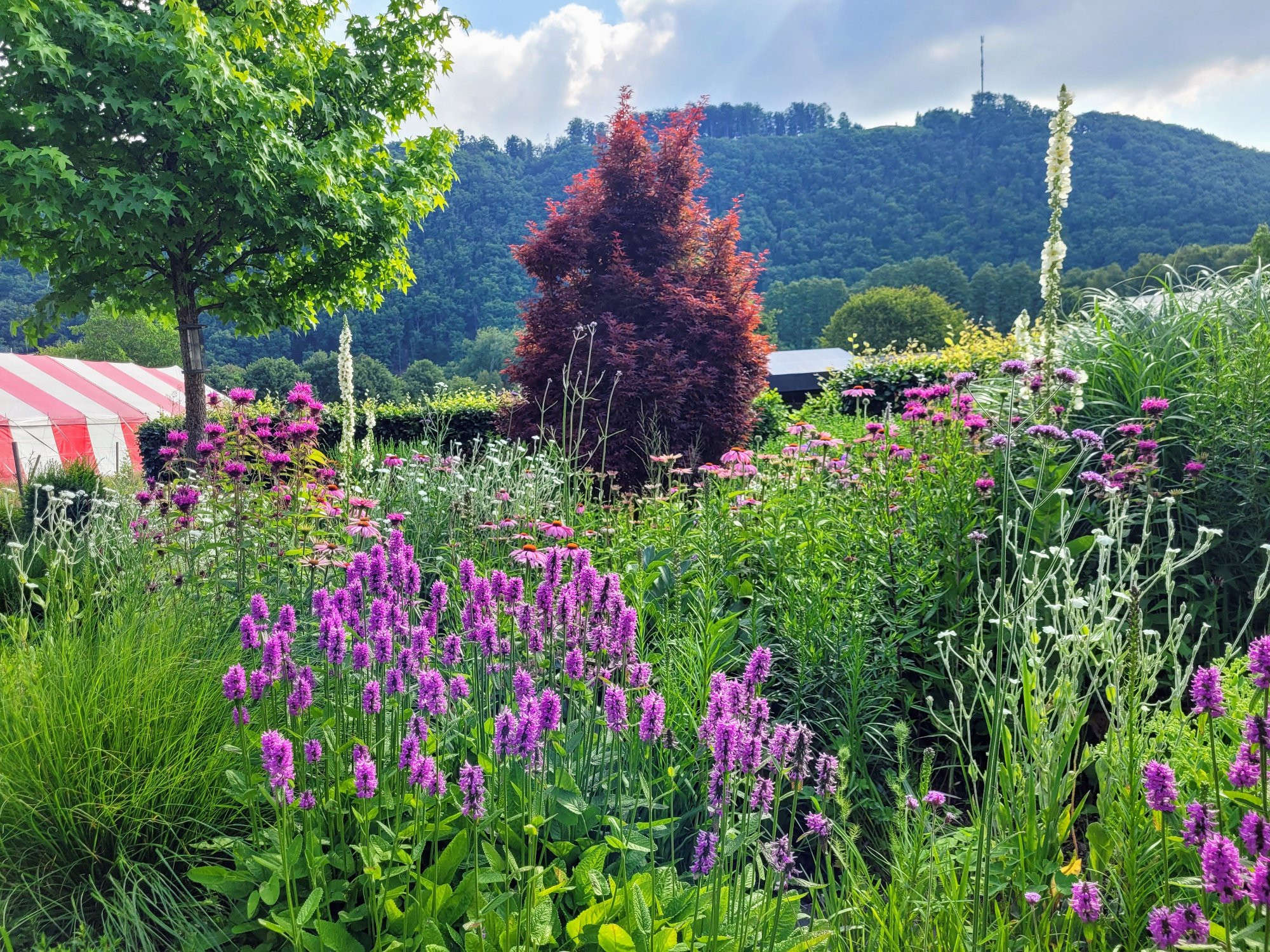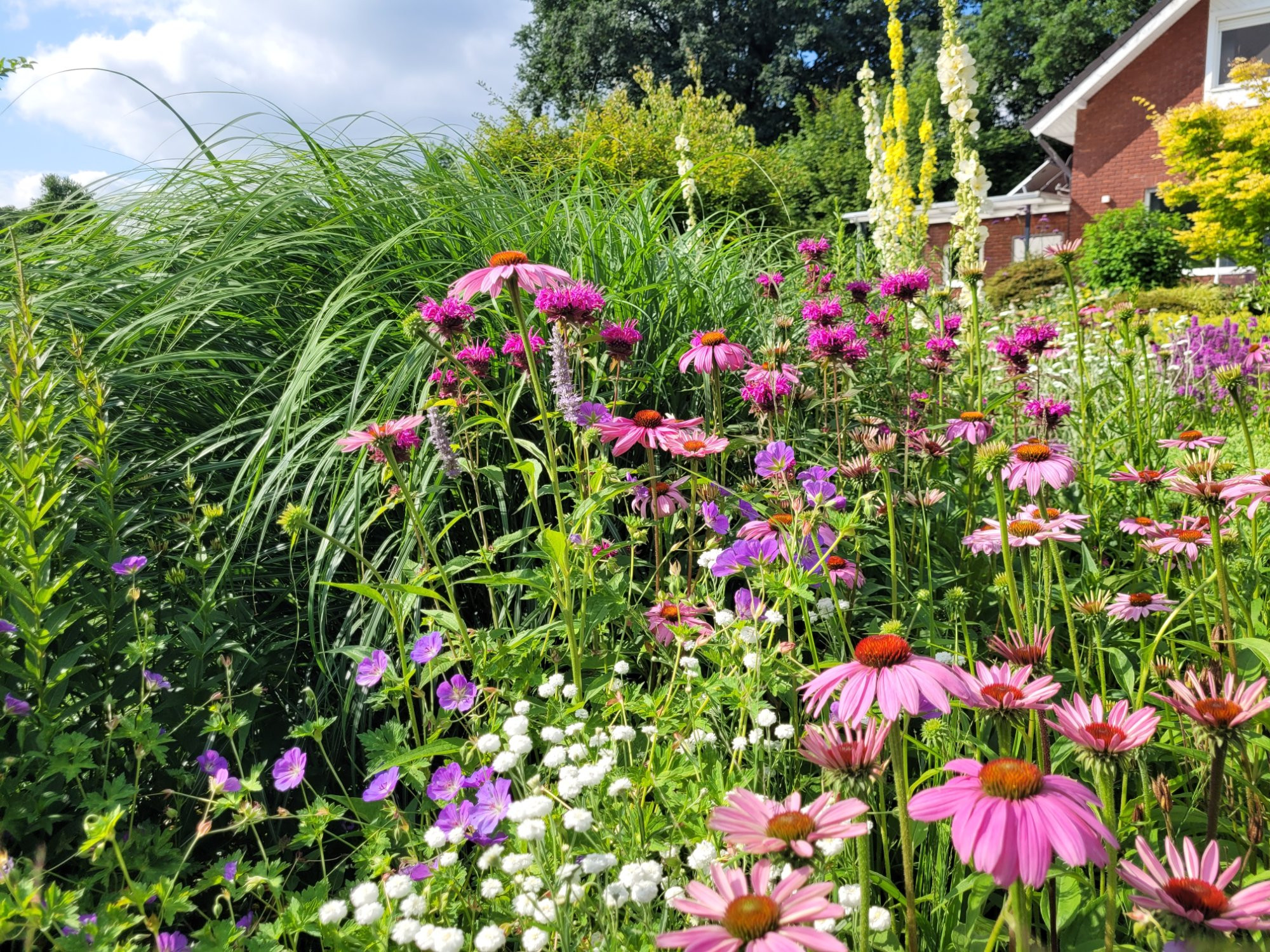 Zurzeit dominieren ganz klar die Farben Pink und Violett getragen durch Echinacea, Monarda und Stachys 'Hummelo '. In Weiß vermitteln Achillea ptarmica 'The Pearl' und Vexiernelken Lychnis coronaria. Klar, auch Verbascum. Wobei sich in diesem Jahr eine große gelbe einfach wild dazu gesellt hat.