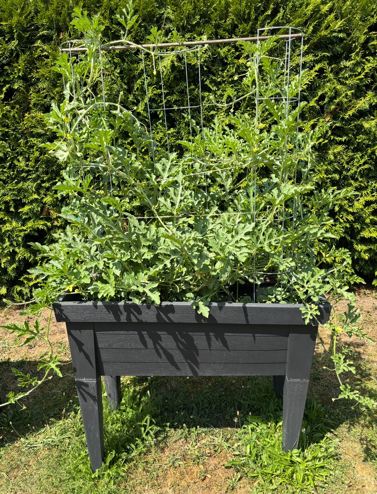 Gitter ist schlecht. Ich hab mal einen begehbaren Rundbogen, quasi ein Folientunnelgestell mit Stahlgitter statt Folie drauf, gesehen mit Wassermelonen überwuchert, das ist toll. Die Fruchte hängen dann durch das Gitter nach innen und werden in Netze gesichert. Muss man aber wohl viel leiten, damit die Ranken nicht auch immer wieder nach untern hängen, sondern oben drauf bleiben.euphorbia23 hat geschrieben: ↑16. Jul 2025, 13:29 - im Gewächshaus ziehen ja einige von euch die Wassermelonen in die Höhe. Funktioniert das auch am Drahtgestell/Gitter im Garten, oder mögen sie es nicht, in die Höhe zu wachsen? Für die ganz schweren Melonen ist das wohl nichts, für mittelschwere und kleine: habt ihr einen Tipp (Bezugsquelle) für Netze, in denen man die Früchte aufhängen kann?