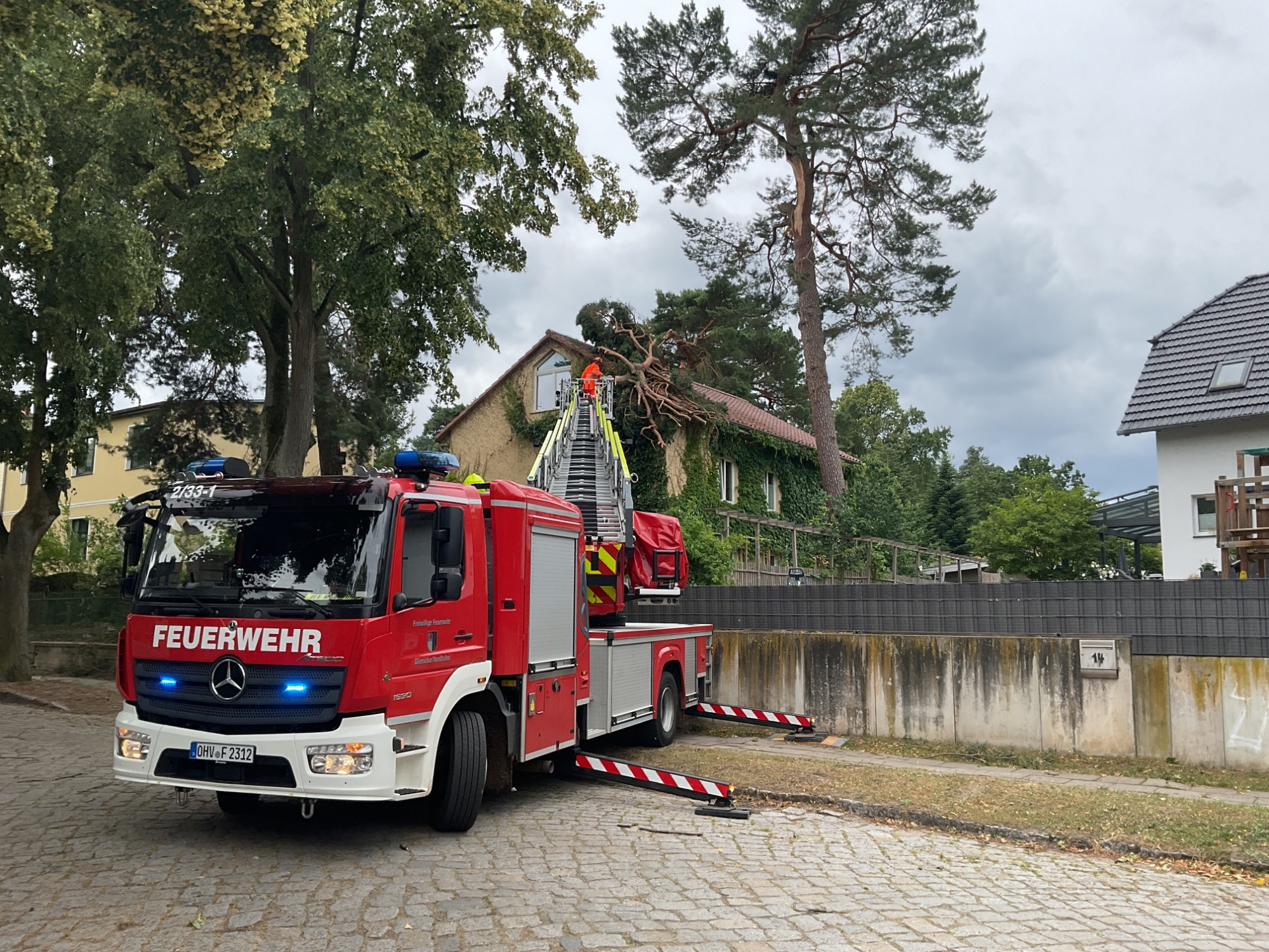 Ja, die Versicherung hat sich heute auch schon gemeldet. Und es war heute ein langer anstrengender Tag. Die Feuerwehr kam am Vormittag und zwei tolle junge Männer der freiwilligen Feuerwehr haben mit Hebebühne und viel Umsicht die halbe Krone vom und aus dem Dach gesägt. Just als sie fertig waren kamen die Dachdecker und haben das Notdach angebracht. Und dann meldete sich noch mein Baummensch vom letzten Jahr, den ich wegen der Notfällung angeschrieben hatte, dass er in der Nähe ist und noch gucken kommt, ob er mit seinem Steiger von der Straße bis zum Baum kommt (das letzte Mal ging das nicht und er musste 4 von 5 Kiefer erklettern).