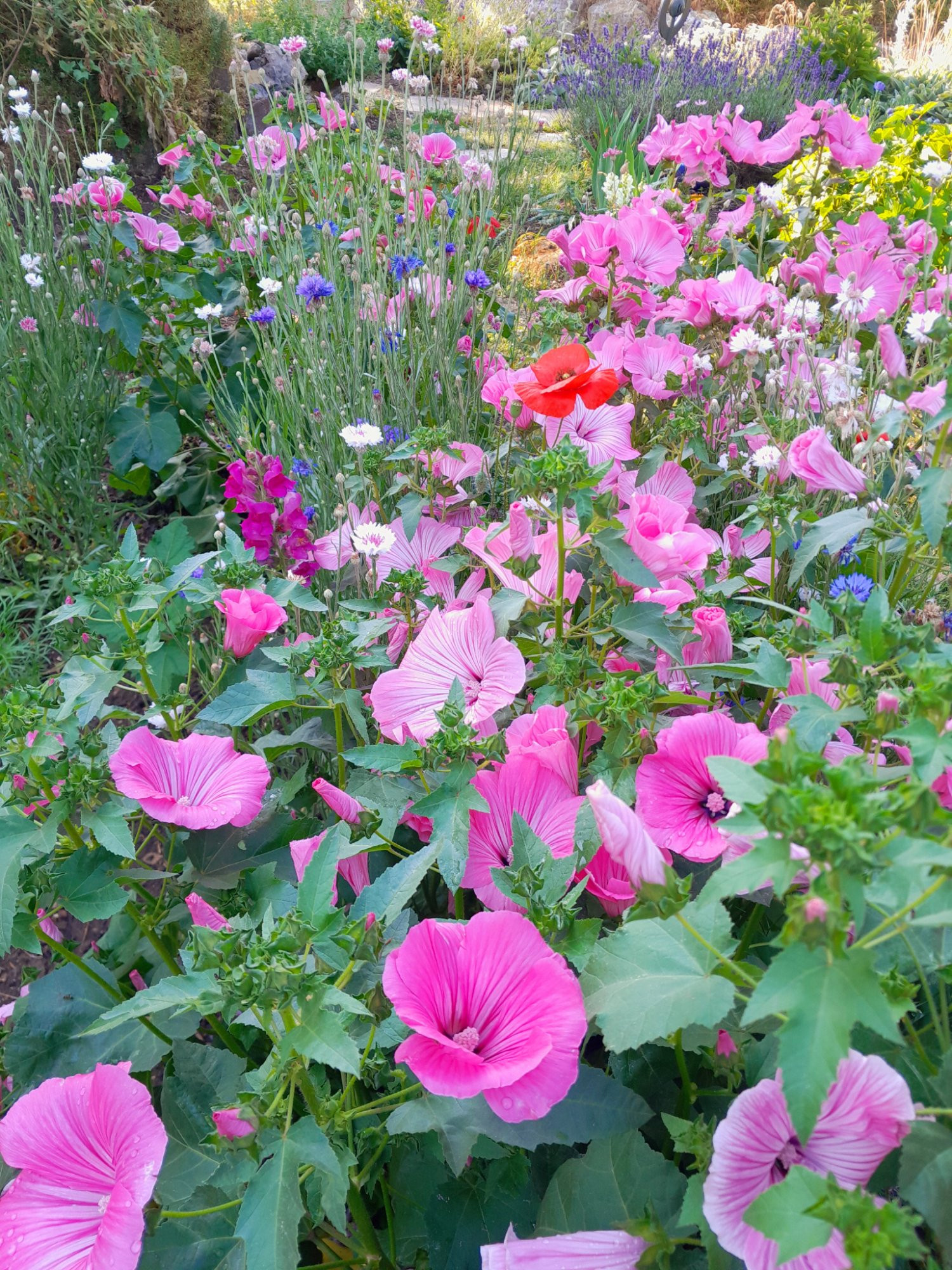 hier blühen die ersten Staudenwicken und Astilben, auch eine erste Königslilie.