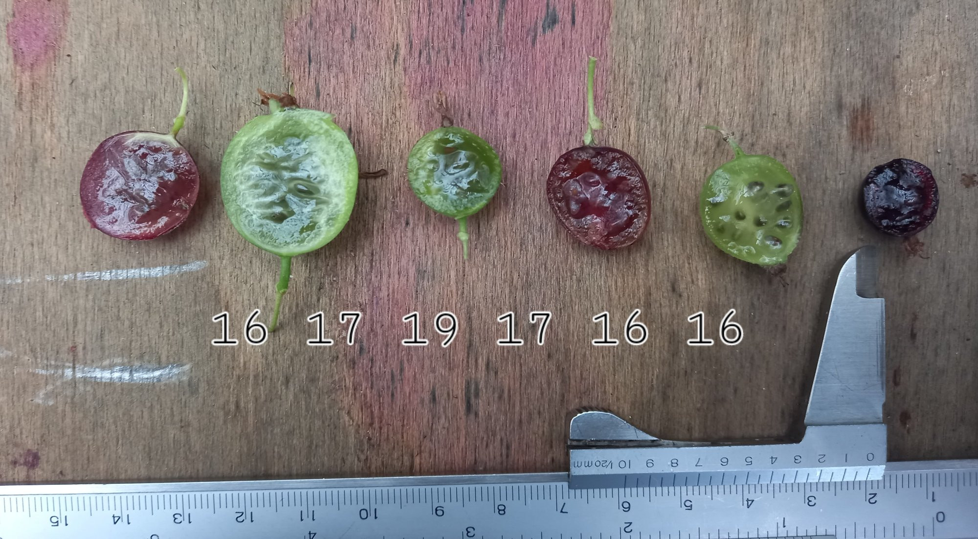 Bin mal quer durch den Garten Gegangen. Von links nach rechts, von oben nach unten: Sämling aus der Hecke, Sämling mit sehr großen Früchten 2cm breite, Sämling mit Haaren, Remarka Überreif, Vermutlich eine unbekannte Sorte aus einem verlassenen Garten, kleine, hängengebliebene Beeren der Schwarzen Honigbeere. Die Zahlen auf dem alten m anderen Bild zeigen die gemessenen Brix Werte an. Reihenfolge ist die gleiche.