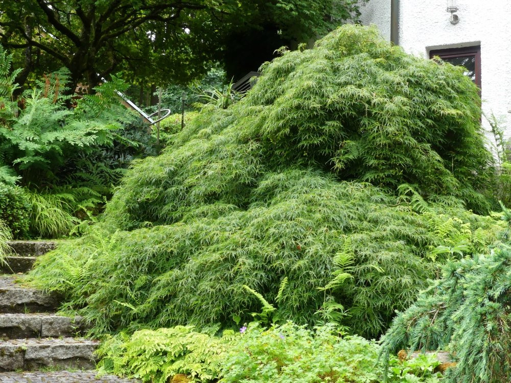 A. palmatum 'Dissectum' - im Austrieb im Frühjahr und im herbstlichen Feuerwerk eine Wucht. Im Sommer, bei voller Belaubung, ergießt sich eine grüne Masse über den Abhang. Von dem bizarren Geäst ist dann leider gar nichts mehr zu sehen. Ich hätte wohl gleich zu Beginn stäben sollen. :-\