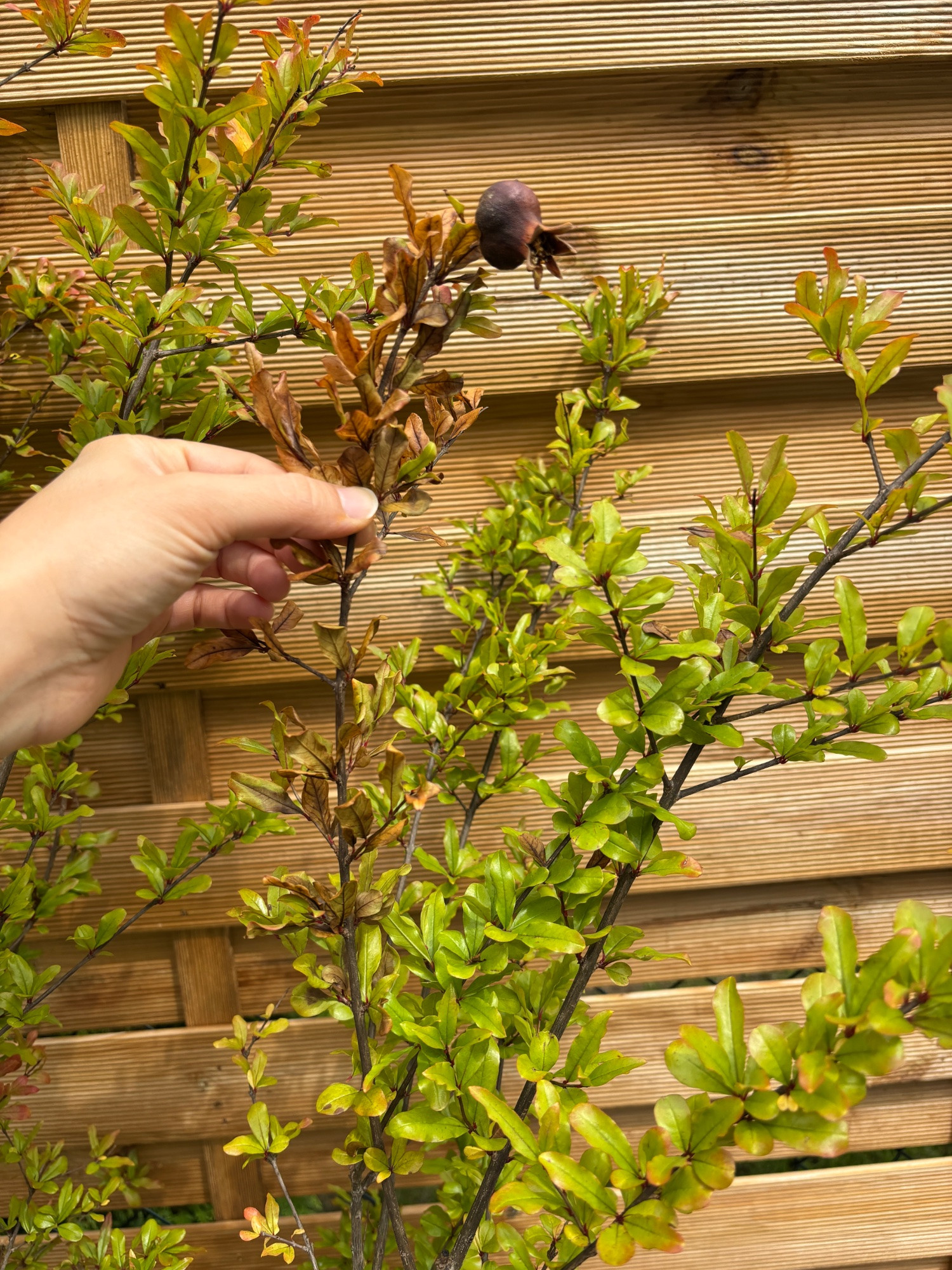 Mein Granatapfel wurde vor etwa 10 Jahren gepflanzt, wurde von einer Säckelblume 'Gloire de Versailles' eingewachsen, bzw unterdrückt. Die Säckelblume wurde mühselig zurückgeschnitten/gesägt und ausgebuddelt und der Granatapfel kam wieder zum Vorschein. Jetzt hat der wieder Sonne, mal sehen, ob ich hier auch mal was ernten kann. Feigen klappen ja auch.