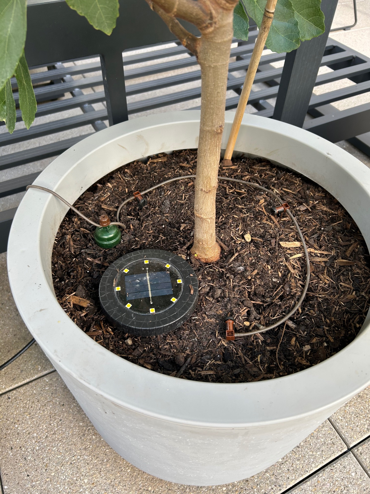 Habe gestern zum Testen an meinen 3 großen Kübelpflanzen die Blumat Tropfbewässerung installiert. Das System hat mir am meisten zugesagt, da jede Pflanze individuell bewässert wird und man einen Tank anschließen kann. Ich mochte die Bewässerung nicht an einen Wasserhahn anschließen. Installation ist einfach. Als Tank habe ich zum Testen einen 5L Kanister genommen und bin gespannt wie lange er im Sommer hebt. Wenn das Systen überzeugt, werde ich es auf die anderen Töpfe übertragen und einen größeren Tank kaufen.