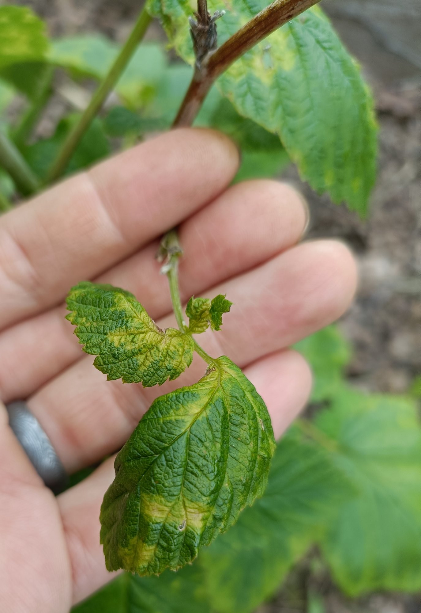 Wir haben letztes Jahr zwei Himbeersorten gepflanzt, die Sommerhimbeeren (Glen Ample) haben deutliche Blattverfärbungen, die Herbsthimbeeren (Polka) zwei Meter weiter bisher nichts dergleichen. Betroffen sind mehrere (jedoch nicht alle) Blätter zweier Pflanzen. Ich dachte erst an Mosaikvirus, aber es könnten wohl auch Blattmilben sein? Gerade die Blattunterseite sieht ähnlich aus wie hier beschrieben.