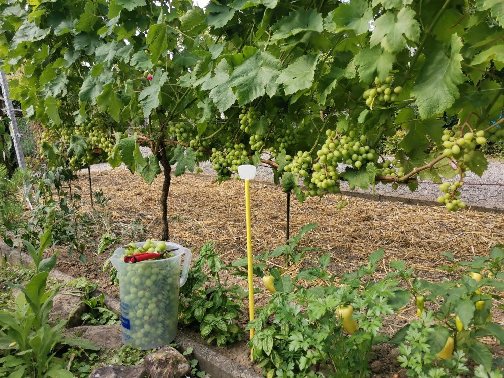 Die Zuckereinlagerung ist in vollem Gange. Habe vor gut einer Woche ausgedünnt, kurz vorher, kann man bis 10° OE machen. Die grünen Beeren gingen in die Agrest-Produktion. Wurde dieses Jahr sehr gut.