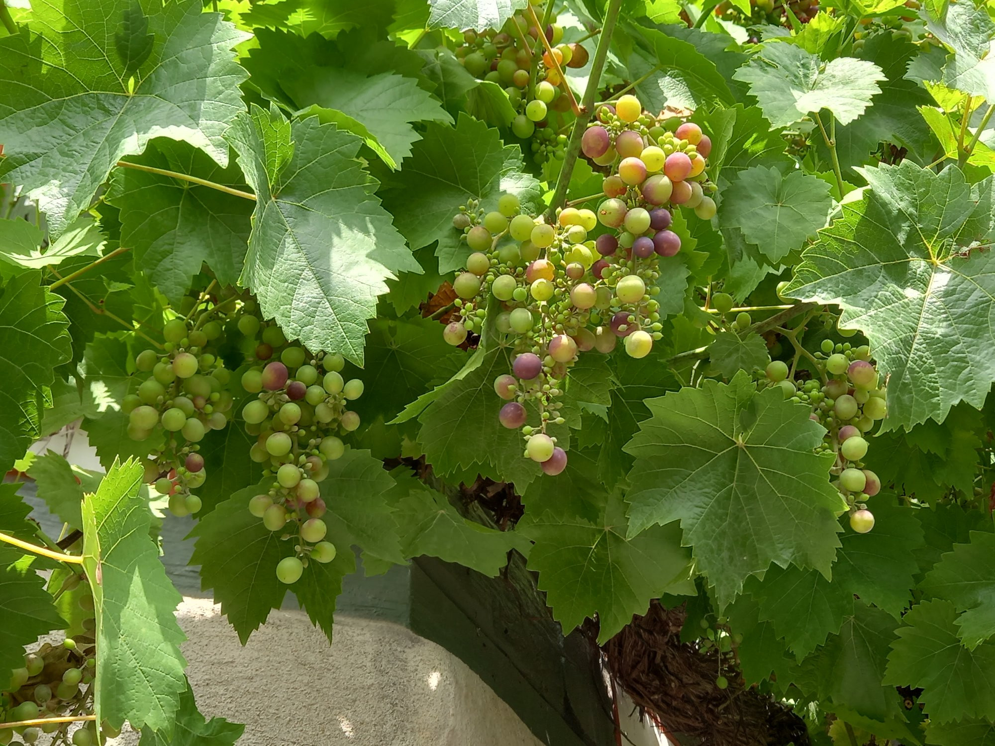 Nicht alle Reben werden wegen der Trauben und Beeren angebaut, viele hier ernten nur die Blätter (und geben natürlich gerne Stecklinge weiter, wurzeln ja so gut). Wenn das mit ernten regelmäßig passiert ist das auch ok, weil man mit den jungen Blättern den bevorzugten Lebensraum der Rebläuse entfernt. Wenn die Ernte ausbleibt, sieht es dann halt auch mal so wie auf dem Foto aus.