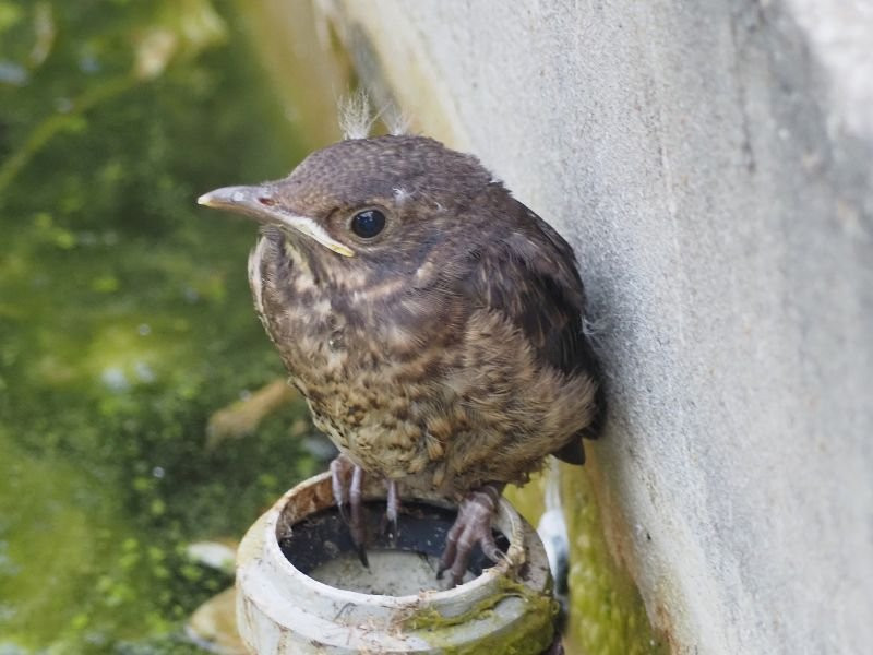 Junge Amsel, noch nicht ganz flügge, aus dem Wasserbecken geholt:
